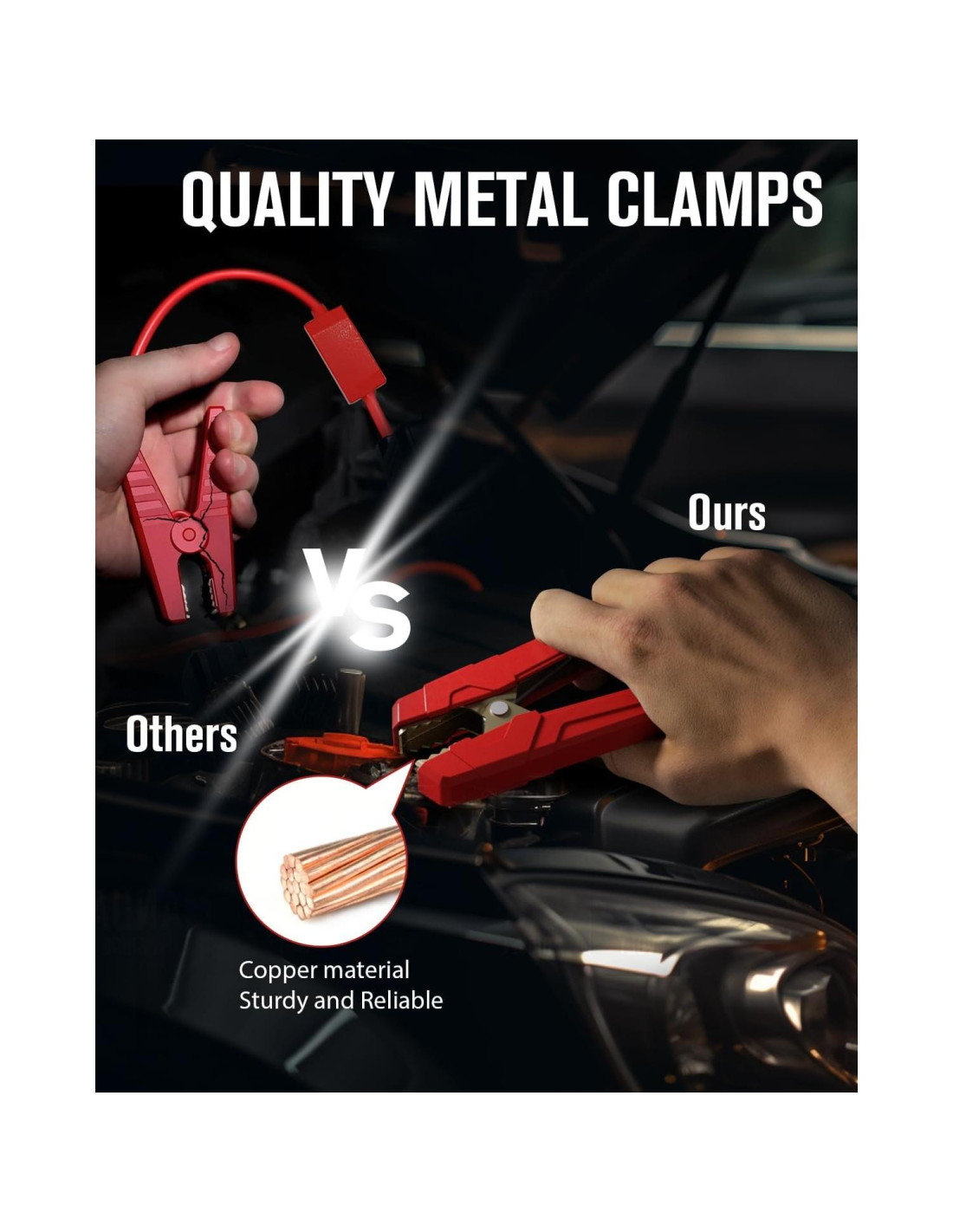 - Pinzas de Metal de Seguridad y Calidad - El paquete de arranque GOOLOO está equipado con 10 tipos diferentes de protección incorporada, aliviando preocupaciones sobre mal uso y chispas. Nuestro objetivo principal fue asegurar que los usuarios se sientan completamente seguros al usar nuestro producto. Los Cables de Arranque Inteligentes están diseñados con pinzas de metal duraderas para prevenir daños que puedan ocurrir por uso a largo plazo.