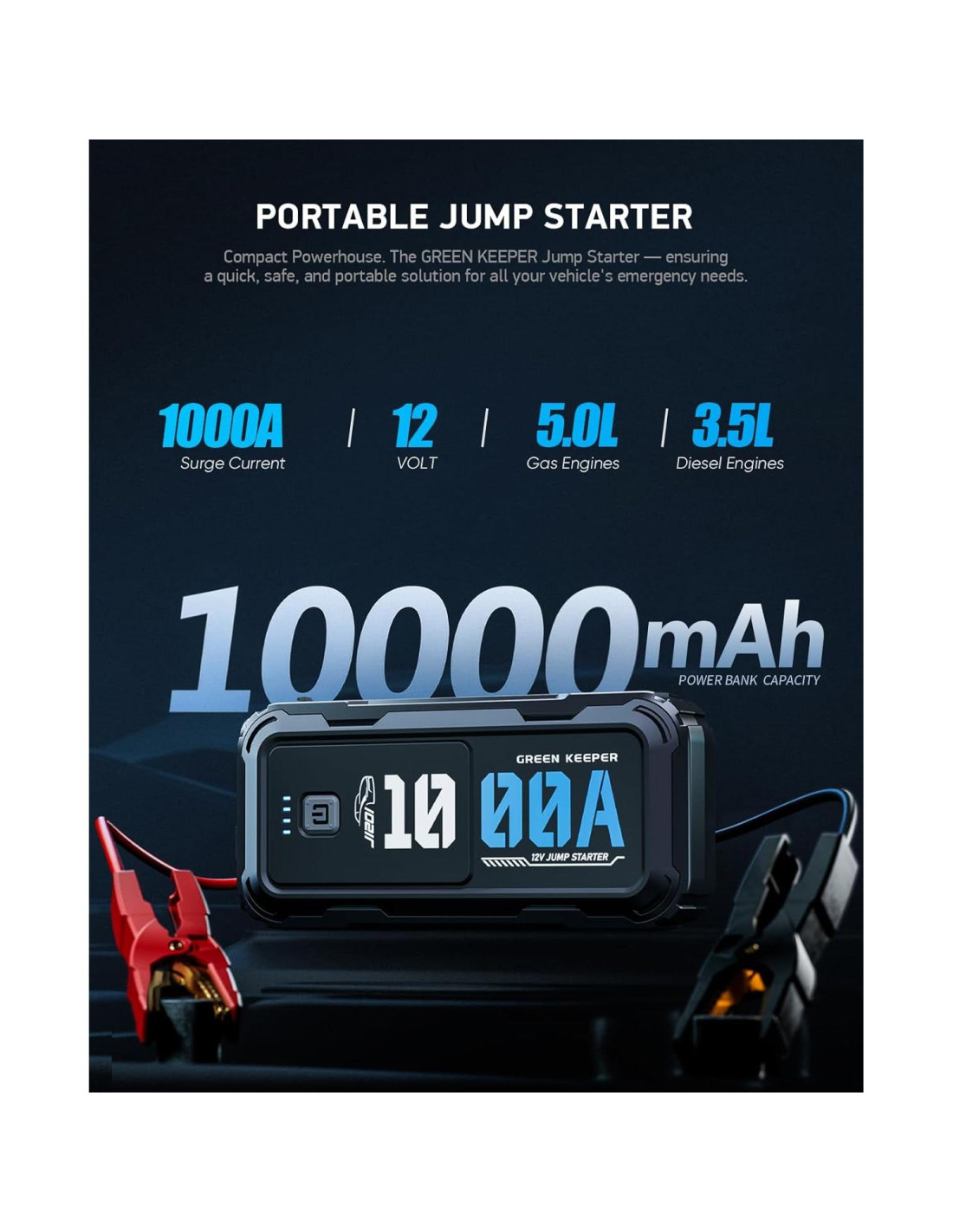 - Arrancador de Coche Portátil Todo en Uno: El Arrancador Green Keeper es un kit completo de arrancador de coche. Viene con un paquete de batería de arranque, cables de arranque de alta resistencia, un cable de carga tipo C y una funda de transporte duradera. Ya sea para un sedán, SUV, motocicleta o barco, este arrancador de coche portátil asegura que nunca estés varado con una batería muerta.