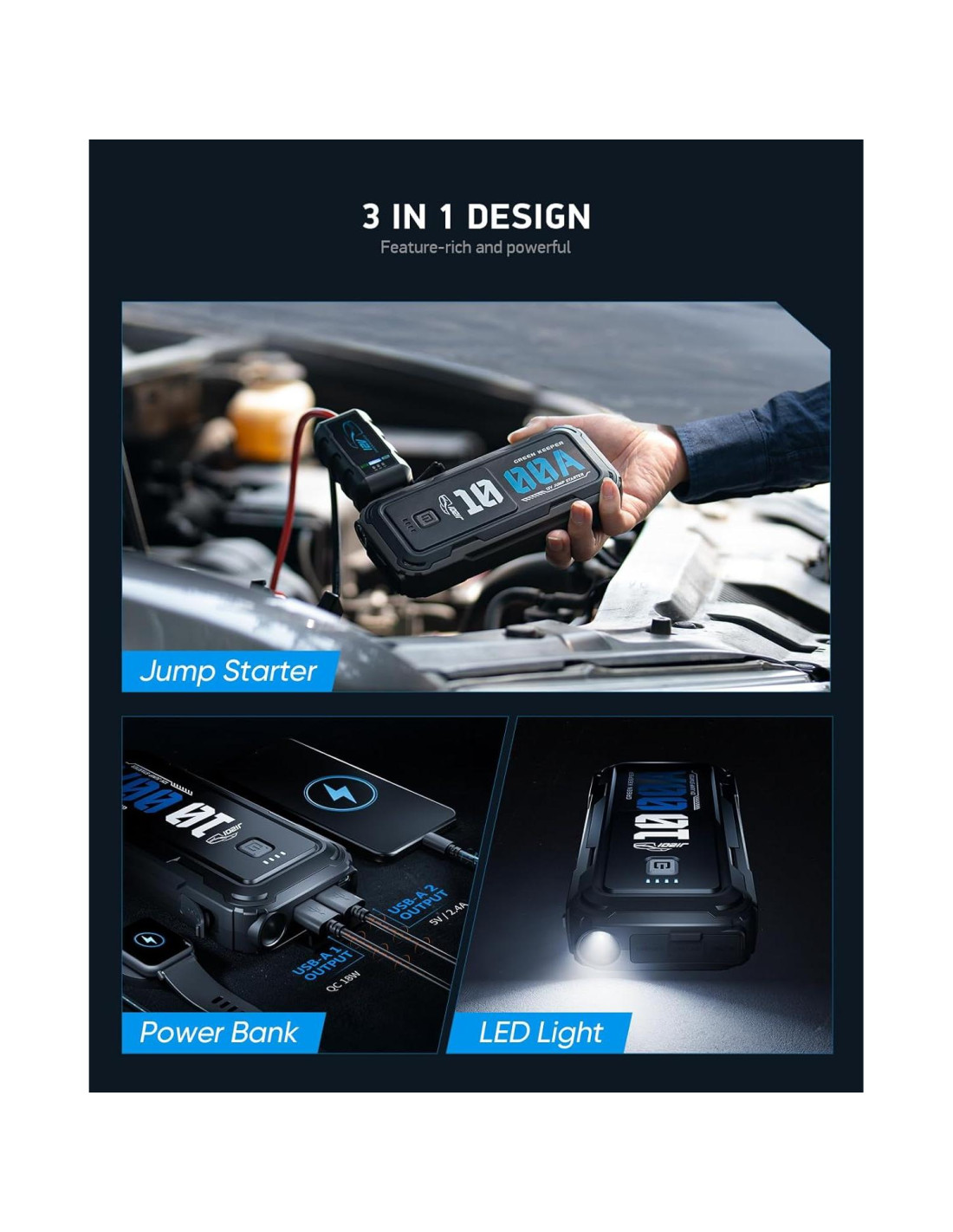 - Paquete de Batería de Arranque con Seguridad en Mente: La seguridad es una prioridad con el Arrancador Green Keeper. Equipado con un sistema de protección inteligente, cuenta con protecciones contra sobrecorriente, sobrecarga, sobredescarga y cortocircuito, junto con tecnología a prueba de chispas y protección contra polaridad inversa.