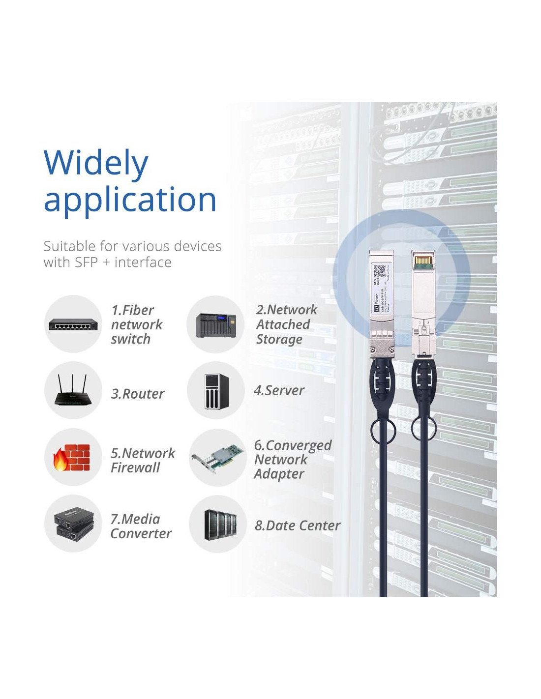 - Aplicación extensa: el cable SFP+ 10Gb se utiliza ampliamente en varios dispositivos, como Switch de Fibra, Almacenamiento, Router, Servidor, Cortafuegos, NIC, Convertidor de Medios, Centro de Datos y otros equipos de fibra óptica con puertos SFP+