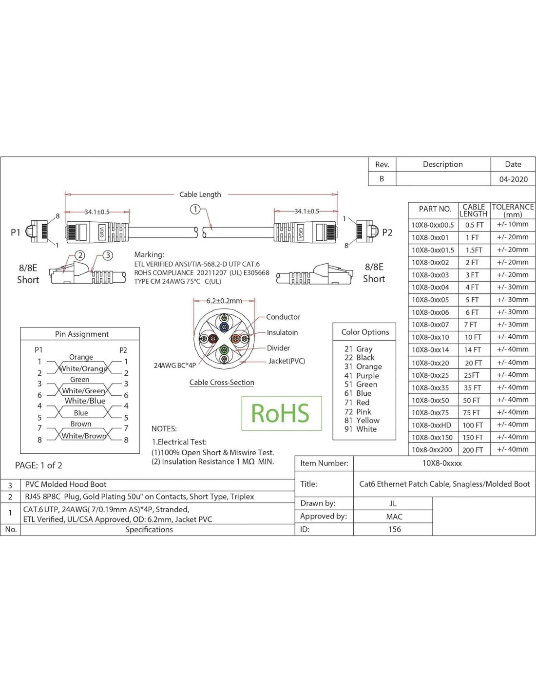 - CUMPLIMIENTO UNIVERSAL CON AMPLIA GAMA DE COLORES: Nuestros cables de parcheo Ethernet Cat6 superan el estándar ANSI/TIA-568.2-D, Cumple con Power over Ethernet (PoE). Está Verificado por ETL, aprobado por UL/CSA y preterminado con conectores RJ45. Está disponible en una amplia variedad de colores para una correcta codificación de colores.