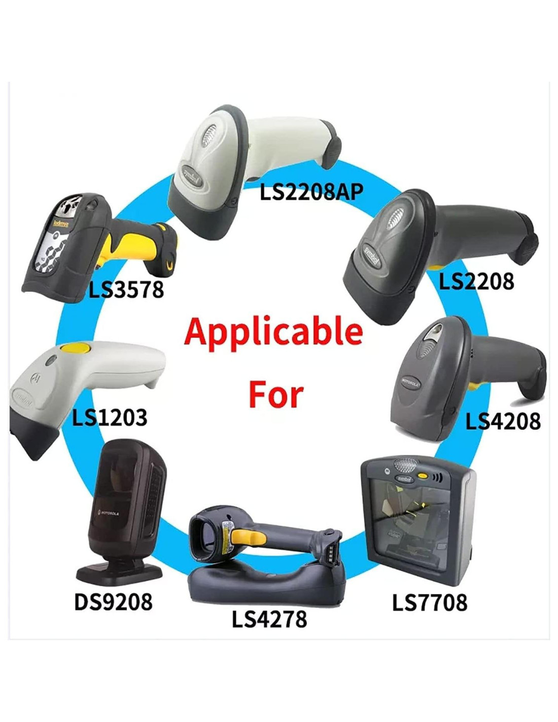 - Dispositivos compatibles: Compatible con varios escáneres de código de barras Symbol Zebra Motorola: LS1203, LS2208, LS4208, LS3408, LS4278, LS3478, LS3578, DS7708, LS7808/7708, LS3408, DS3508, LS/DS3478, DS3578, DS6878, DS9808, DS6707, DS6708, DS6608, DS4208, DS6878, DS9208, DS4308, LI4278, LS9203, DS2208, DS8178, DS2208 DS2278, DS9308, DS4608, DS8108