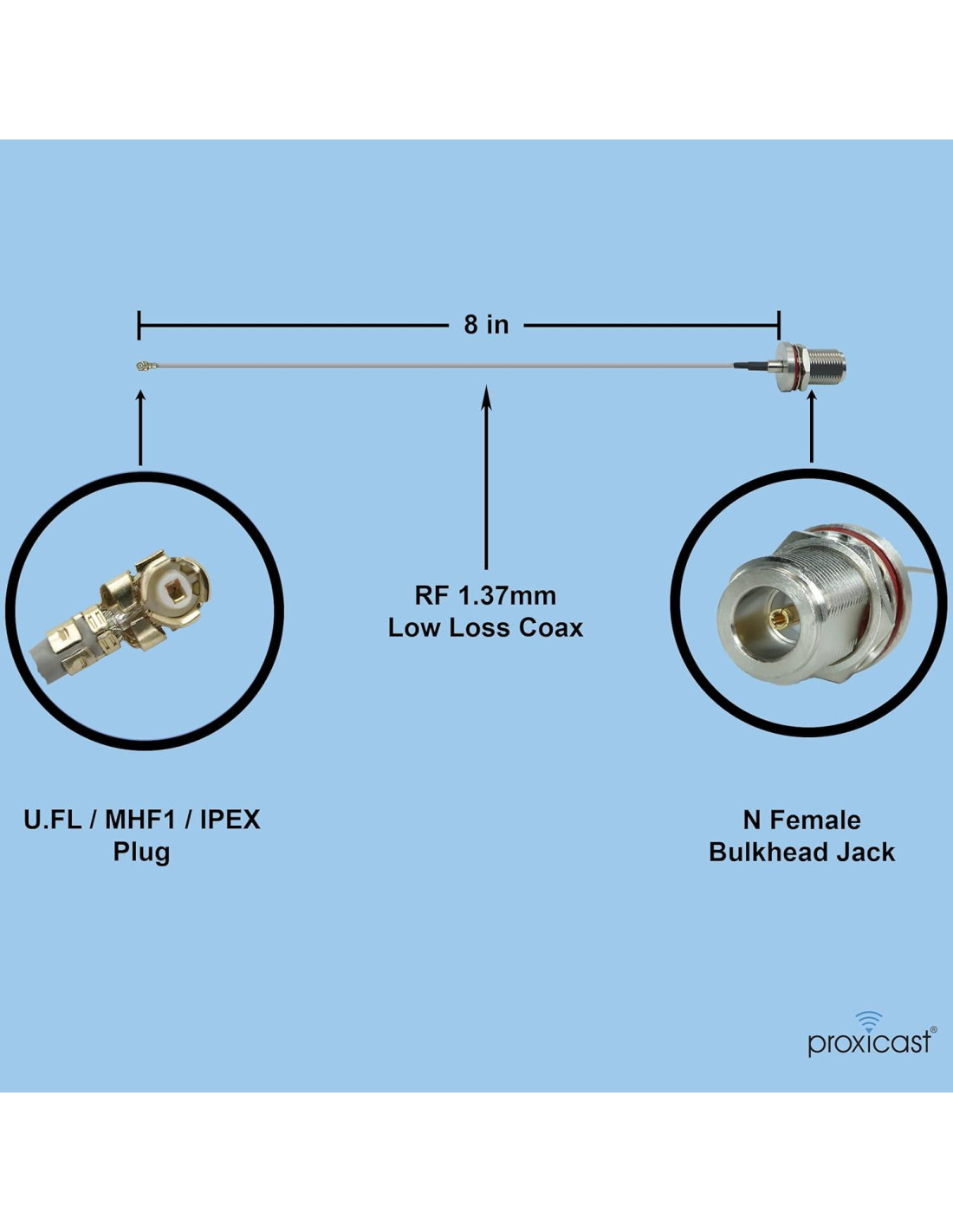 Este corto cable coaxial de alta calidad se utiliza para conectar dispositivos N macho externos como antenas a fuentes de radio RF que tienen puntos de conexión de superficie montados en la placa de circuito Hirose U.FL (I-PEX MHF1). Las aplicaciones comunes incluyen módems celulares 4G / 5G, enrutadores, puntos de acceso MiFi, tarjetas de expansión PCI, puntos de acceso Wi-Fi, sistemas de radio definidos por software (SDR), Bluetooth, ZigBee, Helium, LoRa, GPS y otros. Este cable adaptador está hecho con coaxial de diámetro RF1.37 mm que tiene menor pérdida de señal (atenuación) a altas frecuencias que la mayoría de los otros micro-coaxiales, sin embargo, es lo suficientemente delgado y flexible para la mayoría de las aplicaciones. Su longitud de 8 pulgadas (200 mm) te da mucha flexibilidad para enrutar el cable dentro de espacios reducidos en tu chasis sin sacrificar el rendimiento. NOTA: Los conectores U.FL no están diseñados para soportar ciclos de acoplamiento repetidos. Especificaciones Rango de Frecuencia: DC a 6 GHz Conector 1: Conector U.FL estándar Conector 2: Conector NF hembra estándar Pines: Chapados en oro Tipo de cable: RF1.37 mm Longitud del cable: 8 pulgadas (200 mm) Impedancia: 50 Ohm VSWR: <1.5:1 Voltaje nominal: AC 60V Voltaje de resistencia: AC 200V Resistencia de aislamiento: 500M Ohm mínimo / DC 100V Cumplimiento RoHs: SÍ Temperatura de operación: -40C a +85C