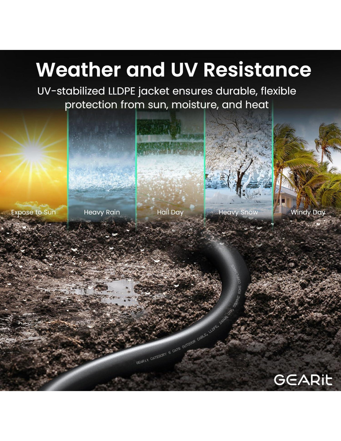 - Protección para Exterior y Entierro Directo: chaqueta impermeable resistente a UV LLDPE (PE) de alta resistencia convierte este cable ethernet exterior certificado en una solución robusta de cat6 para enterramiento directo para instalaciones durante todo el año sin conducto.