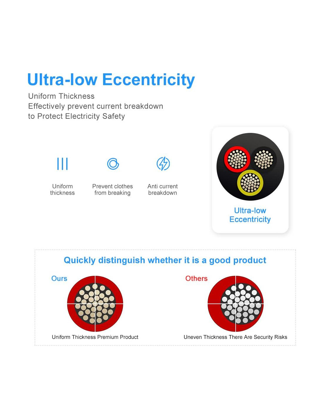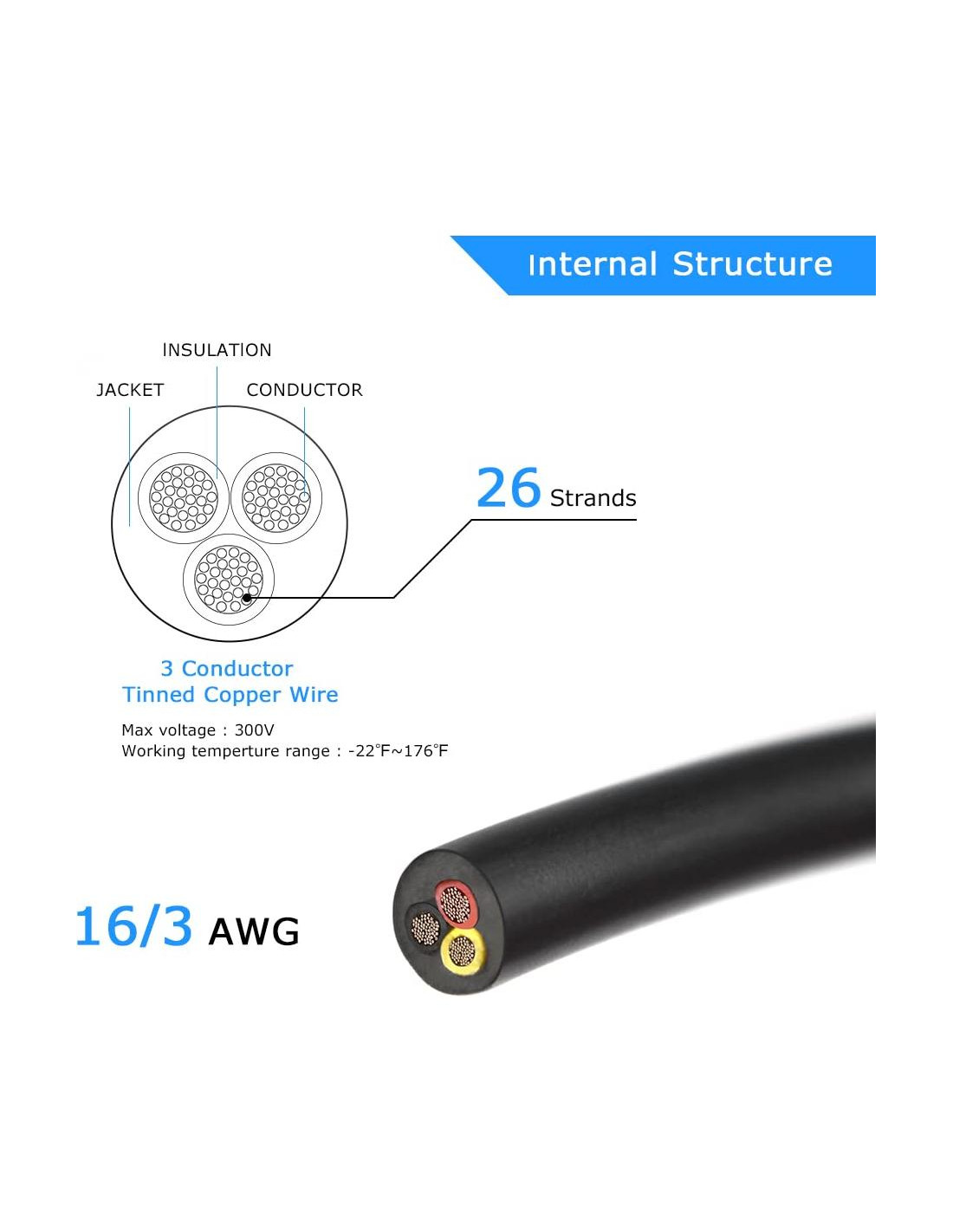 - Alta conductividad: el cable de 16 AWG tiene 3 cables internos, cada cable con 26 hebras de 0.25mm de grosor de cobre estañado. El cobre libre de oxígeno de alta precisión contenido en el cobre estañado tiene menor resistencia y mayor conductividad. La vida útil es mucho más larga que la del cable de cobre desnudo