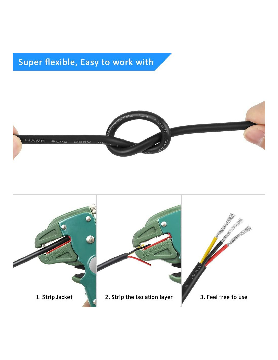 - Fácil de usar: nuestro cable de 16 AWG tiene características de alta conductividad, baja resistencia, suavidad y puede ser retorcido y extendido a voluntad. Fácil de pelar y cortar. El cable de cobre estañado es fácil de soldar. El grosor es uniforme, ultra baja excentricidad, lo que puede prevenir eficazmente la ruptura de corriente y el fuego