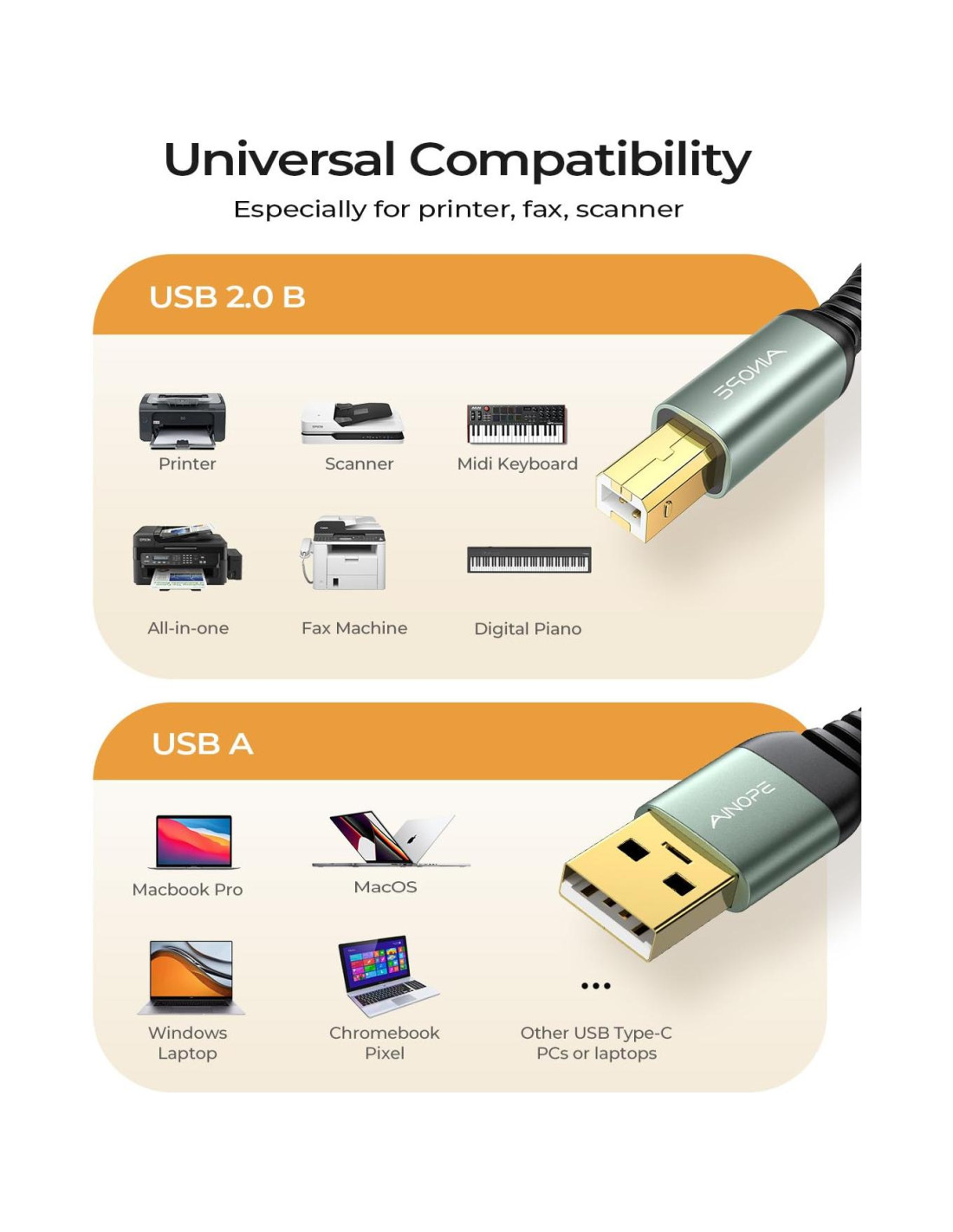 - 3: CONECTORES 100% BAÑADOS EN ORO-El cable de impresora USB AINOPE cuenta con un cable de cobre de alta pureza con anti-oxidación, con blindaje mejorado y un mayor número de conductores para una durabilidad mejorada. Sus conectores 100% bañados en oro ofrecen una transmisión de señal excepcional, minimizando la interferencia EMI/RFI para resultados de impresión estables y claros. Con funcionalidad plug-and-play, no hay necesidad de instalaciones de controladores o ajustes de orientación del cable-solo un rendimiento rápido y sin complicaciones cada vez.