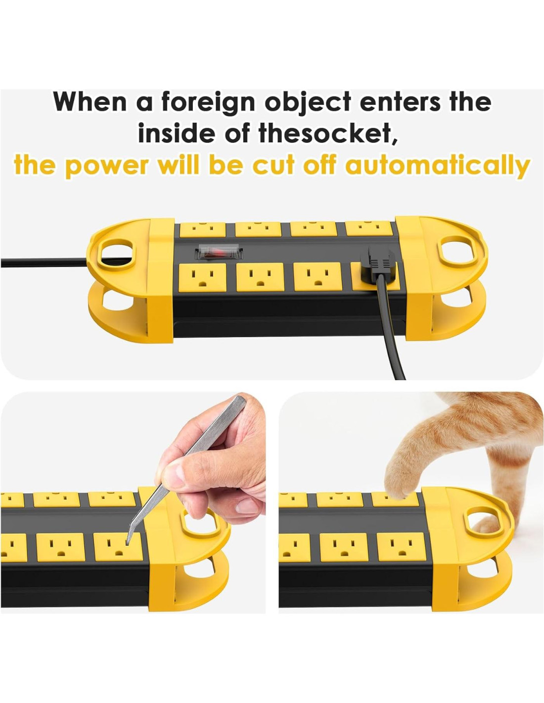 - Tira de energía para interiores o exteriores con cable de alimentación de 1.83M 16AWG, Salida CA: 12A/125/1500W. tira de energía exterior con protector de sobretensión de 1200J. Los extremos están diseñados con una función de envoltura de cable para ayudarle a almacenarlo mejor cuando no esté en uso.