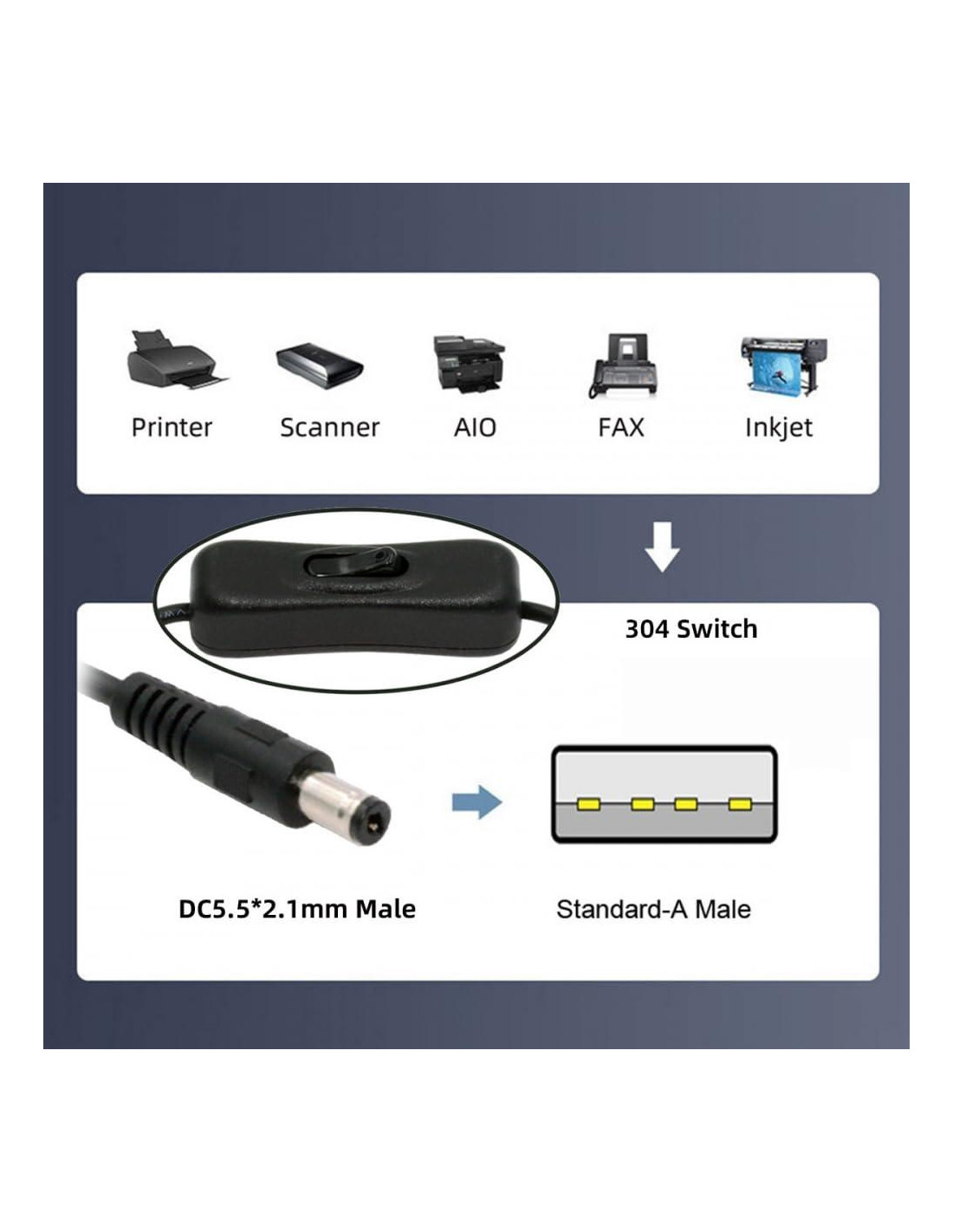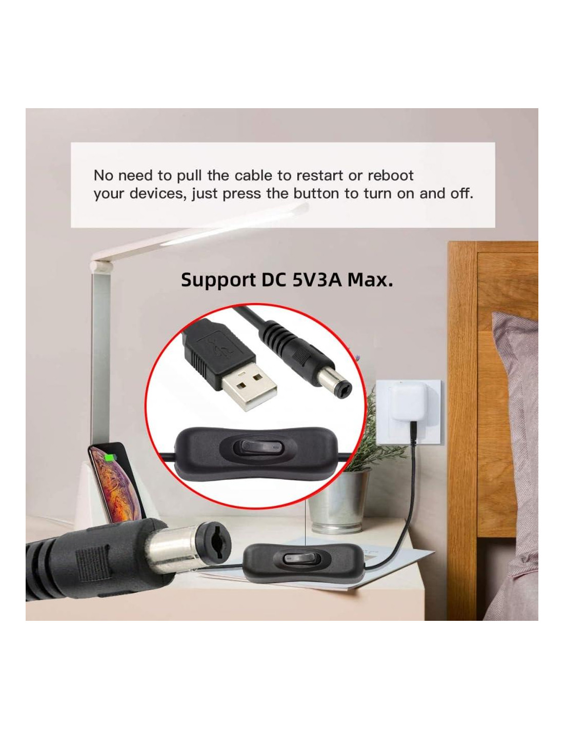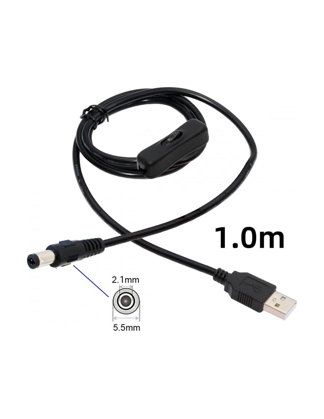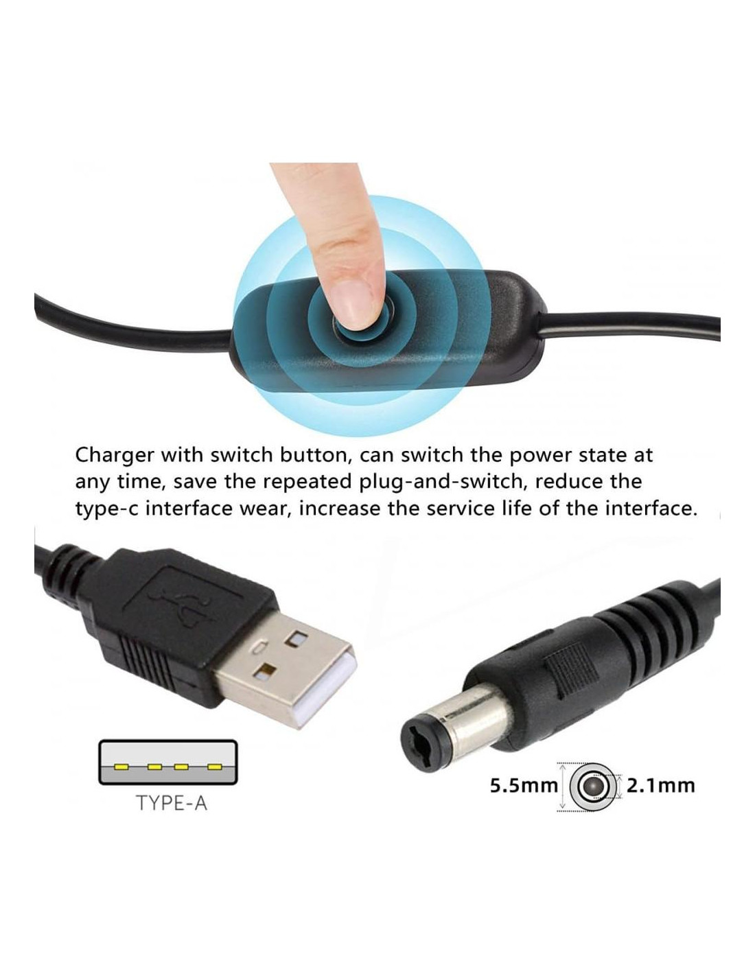 Cable DC 5.5x2.1mm con conector USB Tipo-A y botón de encendido/apagado para lámpara de escritorio, ventilador, cámara. El cable con interruptor no transfiere datos, solo soporta carga de energía DC5V. (5V 3A máx), longitud del cable 100cm. El cable con interruptor USB es adecuado para cargar dispositivos digitales y productos electrónicos con interfaz DC, como tacógrafo, barra de luz LED, lámpara de mesa LED pequeña, lámpara de mesa USB pequeña, ventilador USB y otros electrodomésticos de pequeña potencia para suministro de energía y extensión de carga. La fuente de alimentación se puede cambiar en cualquier momento presionando el botón para abrir y cerrar, evitando inserciones y extracciones repetidas, reduciendo el desgaste en la interfaz DC y aumentando la vida útil del cable. El cable de alimentación DC es un cable de dos núcleos que solo se puede usar para cargar, corriente superior a 3A, y soporta dispositivos de baja potencia. No soporta el protocolo de carga rápida. La transmisión de datos no es compatible, y el cable no se puede usar para dispositivos de alta potencia como computadoras, y no se puede enchufar directamente en el cargador PD.