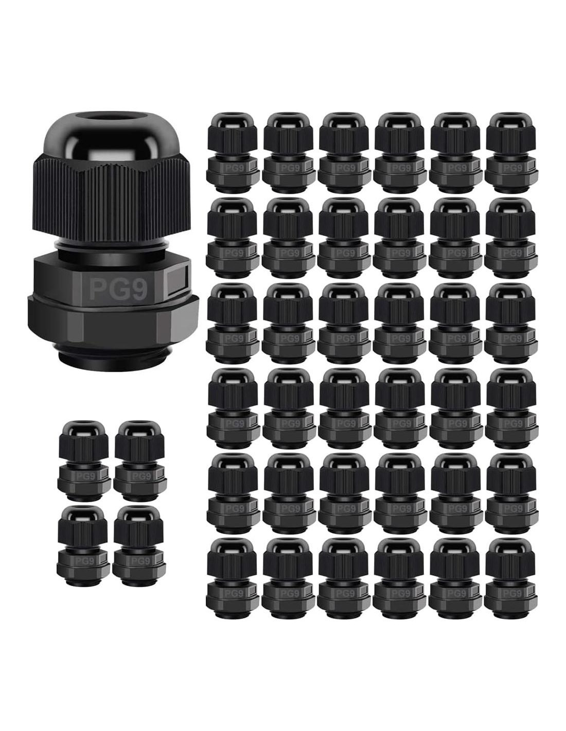 Alta Calidad PG9 Impermeable Ajustable 4-8mm Juntas de Cable Gland Con Juntas Dentro de cada grommet tienen anillo de sellado de goma para ajustar el conector, diseño impermeable. Amplio rango de sujeción con fuerte resistencia a la tracción, no causa daño a los cables o dispositivos Fácil de usar: separa las piezas primero, pasa el cable a través de él, aprieta el gland, no es necesario desensamblar Nota: Por favor elige el tamaño adecuado de los cable glands para el artículo que pasa a través de él Paquete incluido: 40 pcs cable glands con juntas. especificaciones: Modelo: PG9 cable glands. Material: Plástico PP de alta calidad. Color: Negro. Cable glands ajustables 4 - 8mm. Rango de cable: 4 - 8mm (0.16 - 0.31 pulgadas). Diámetro exterior de la rosca: 15.5mm (0.61 pulgadas). Longitud de la rosca: 8mm (0.32 pulgadas). Función: Resistente a ácidos, álcalis y alcohol, Resistente al calor, Retardante de llama, etc. Temperatura de trabajo: -40C - 100C, máximo hasta 120C (248F).