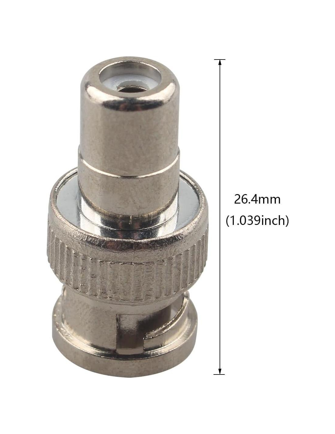 - Tipo y Detalles: 6 x Conector BNC Macho a RCA Hembra. Color: Plateado. Material: Aleación de cobre y zinc. Carcasa sólida de fundición. Conductor interno: Cobre puro.