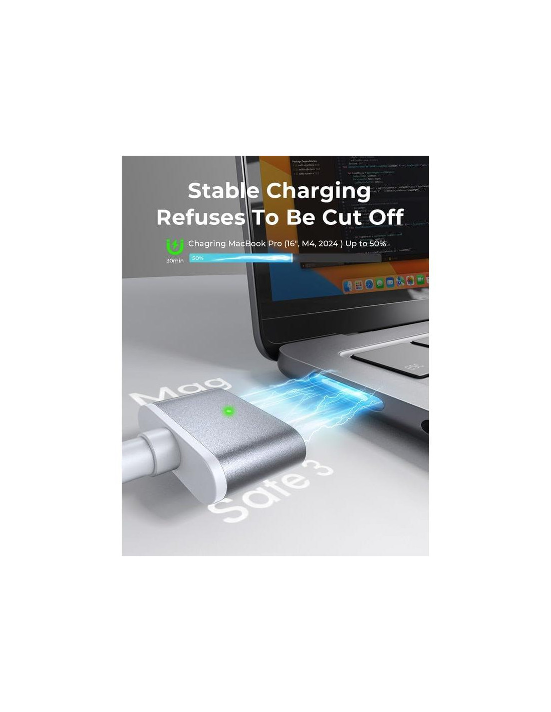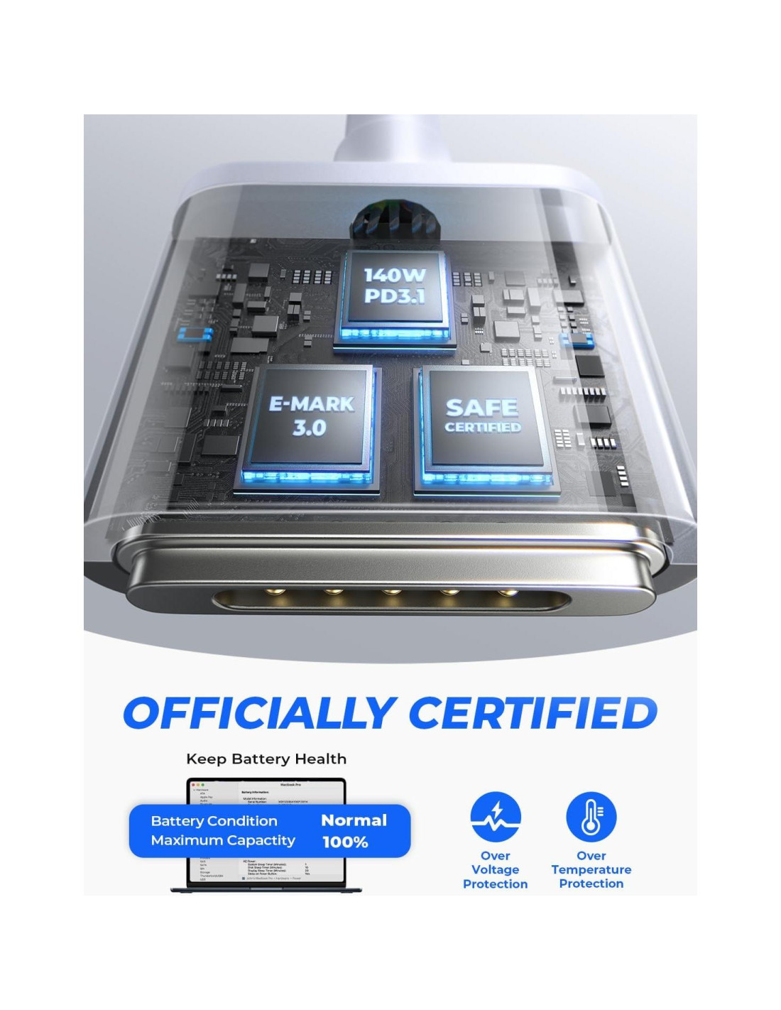 - Carga Súper Rápida de 140W PD 3.1: Este cable de carga Magnético Gen 3 ofrece una velocidad de carga súper rápida de 140W PD 3.1 como los OEM, este cable usb c a Mag-Safe 3 alimenta tu MacBook de manera eficiente con un adaptador de 96W o 140W, alcanzando el 50% en solo 30 minutos. NOTA: Al usar ciertos adaptadores de corriente, puede ocurrir un ligero retraso de 15-20 segundos en el proceso de carga debido a nuestro mecanismo de seguridad magnético, pero ten la seguridad de que es una señal de que tu laptop está bien protegida