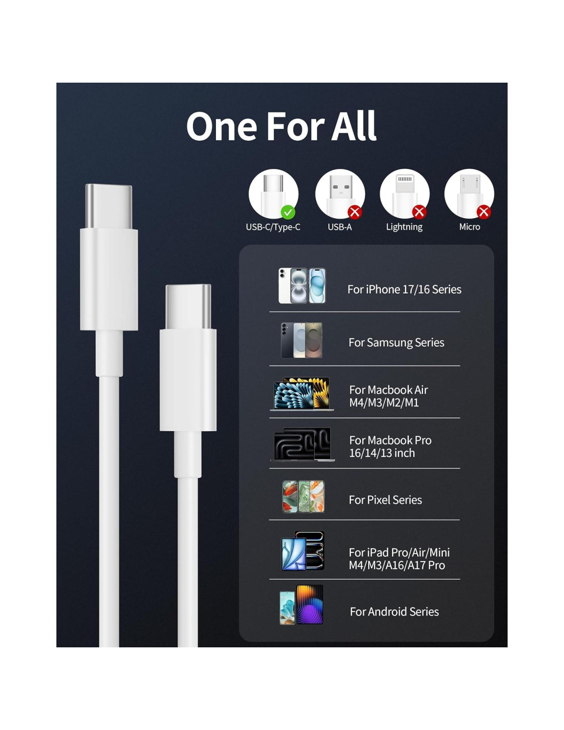 - Compatibilidad Universal: Cable USB C a USB C compatible con iPhone 17/17 Pro/17 Pro Max/Air 2025/16/16 Pro/16 Plus/16 Pro Max/15/15 Pro/15 Plus/15 Pro Max/16e, iPad Pro 13/12.9/11 pulgadas, iPad Air 13/11 pulgadas M3/M2, iPad Air 5ta/4ta Generación, iPad A16/10, iPad Mini A17 Pro/6ta, MacBook Air/Pro, Samsung Galaxy S25/S24/S23/S22, Google Pixel 9/8/7/6, Moto, LG, Tableta, Android, y más