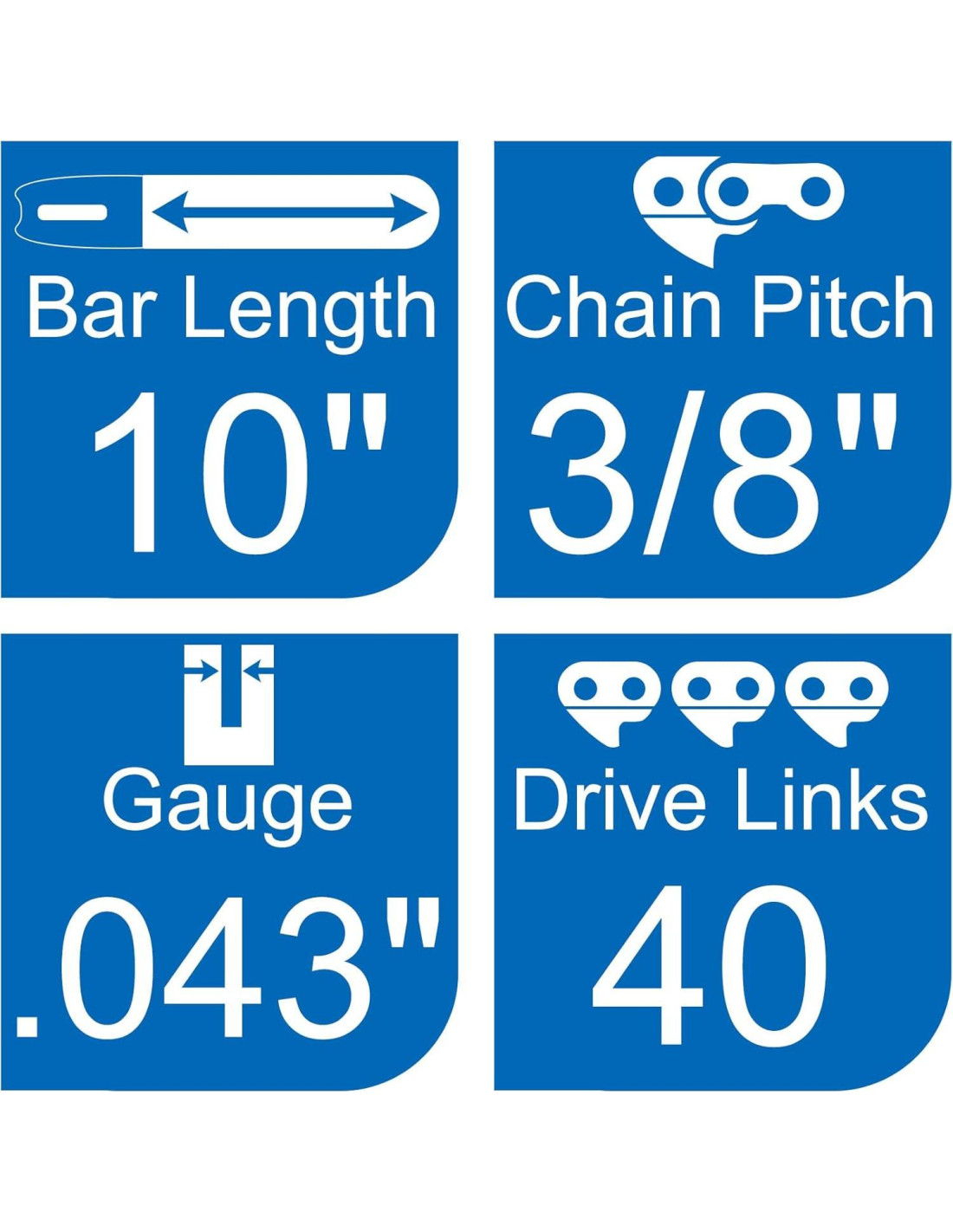 - Parámetros de la cadena: 3 piezas de 10 pulgadas 3/8" .043" calibre de cadena 40 enlaces de transmisión.