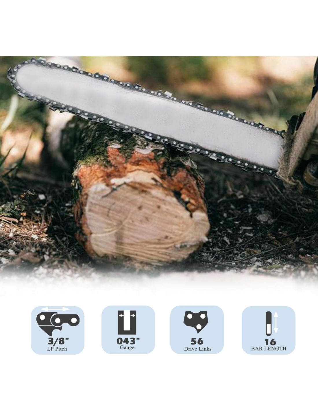 - cadena de motosierra de 16 pulgadas: el paso de la cadena es de 3/8" (0,95 cm) y el grosor de la cadena es de 0.043" (1,09 mm), lo que es adecuado para la motosierra Milwaukee M18 Fuel 2727-20.