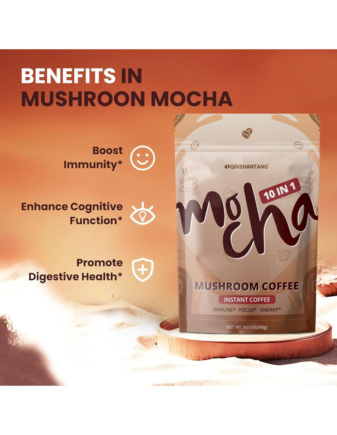 - MEZCLA DE CHAMPIÑONES ADAPTOGÉNICOS: Nuestra Mezcla de Café Mocha de Champiñones presenta una mezcla única de Melena de León, Chaga, Reishi, Cordyceps, Maitake, Cola de Pavo, Phellinus igniarius, Tremella, Poria y Hongo Negro. Estos champiñones son conocidos por sus propiedades adaptogénicas, apoyando la concentración, la inmunidad y la salud intestinal