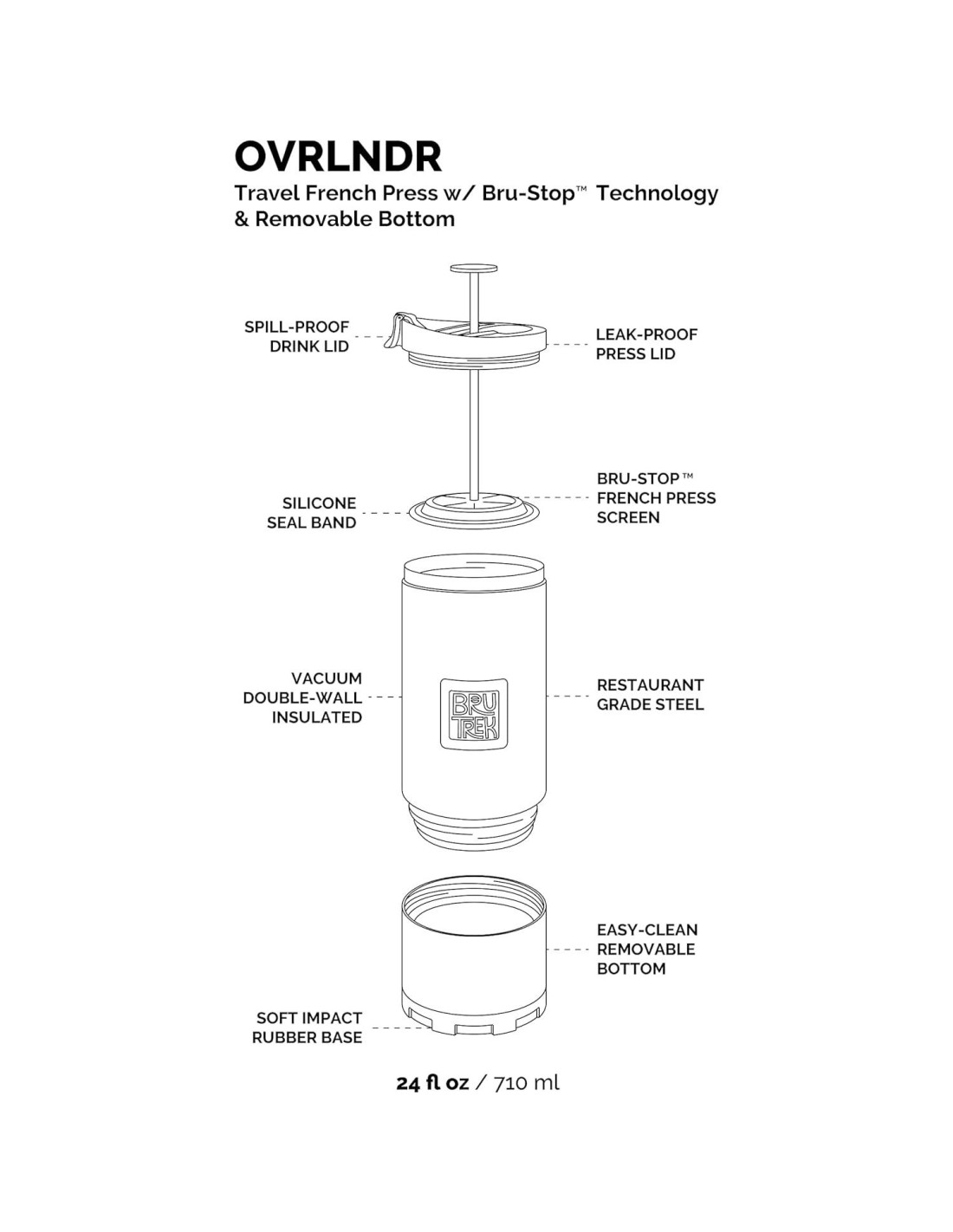 - FONDO REMOVIBLE - El OVRLNDR es la única prensa de café en el mercado con un fondo removible patentado. Después de presionar y beber todo el café, ¡desenrosca cuidadosamente la base para una fácil limpieza! Habrá un poco de líquido extra aquí, para ayudar a remover los posos restantes.