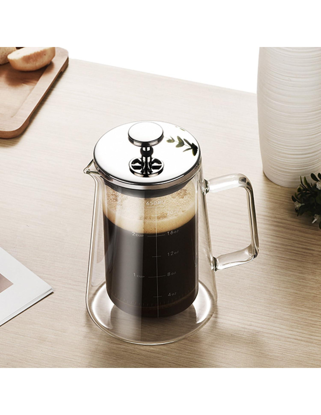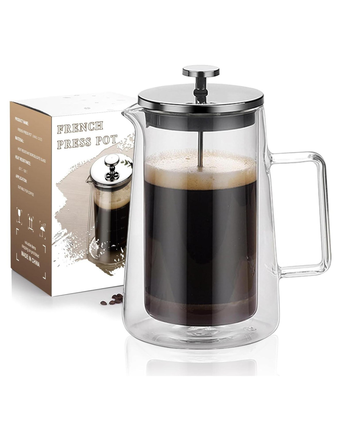 - [Material] Nuestra cafetera de prensa francesa tiene una cafetera de doble capa hecha de vidrio borosilicato resistente al calor, asegurando su durabilidad y calidad.