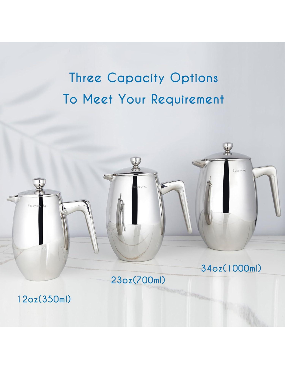 - [Olla de Café Francesa con Innovador Sistema de Filtración de 4 Niveles] Utiliza la última tecnología de fabricación y combina estética para diseñar esta elegante olla de café francesa, tetera. Con el filtro de malla de acero inoxidable micro extra fino de 4 niveles, puedes preparar tu café o té con el filtro, para obtener un mejor sabor sin que los posos de café se mezclen en tu café.