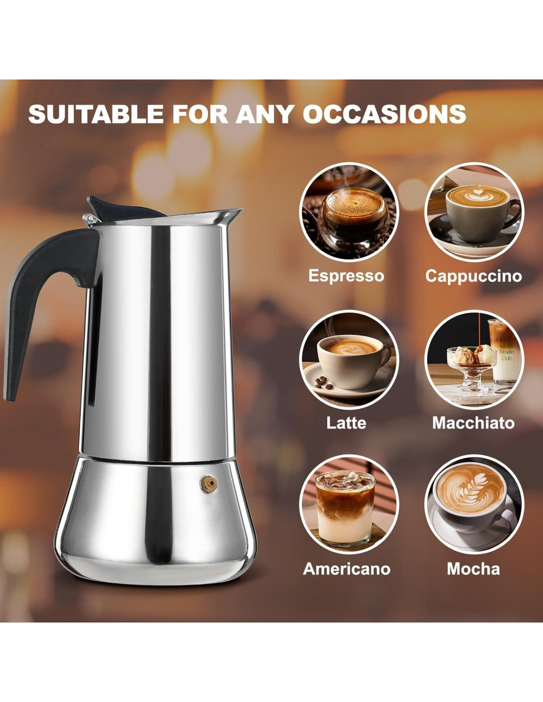 - Compatible con Todas las Estufas: Esta cafetera espresso de estufa es adecuada para cualquier cocina, como gas, estufa de inducción, estufa de cerámica, estufa eléctrica, estufa de alcohol y estufa de camping de propano. No necesitas salir, puedes hacer fácilmente tus lattes, mochas, batidos, macchiatos y cappuccinos favoritos. Usamos ingredientes de alta calidad para hacer la extracción, haciendo que el café sea más sabroso y brindándote un disfrute de café de alta calidad.