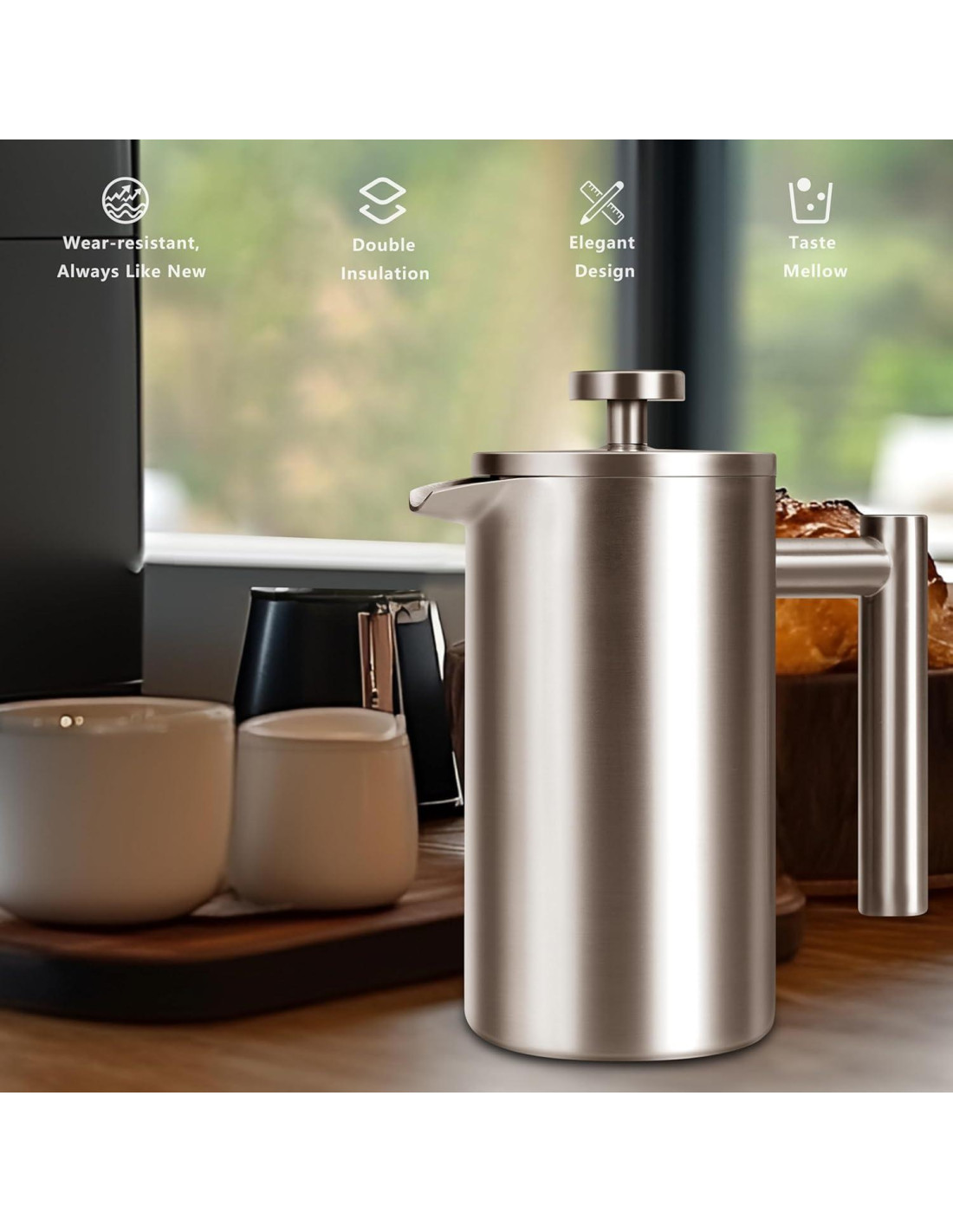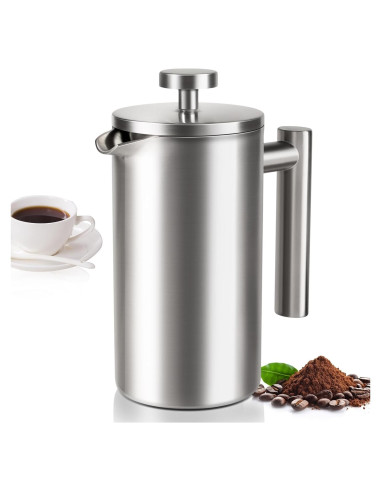 - 2. Prensa francesa más resistente: El cuerpo robusto y de doble capa hecho de acero inoxidable mantiene bien la temperatura. El café caliente puede mantenerse caliente durante una a dos horas después de ser servido. Preserva tu tiempo y energía. La leche solo tiene que ser vertida cuando necesites una taza de cappuccino; ya no es necesario calentarla.