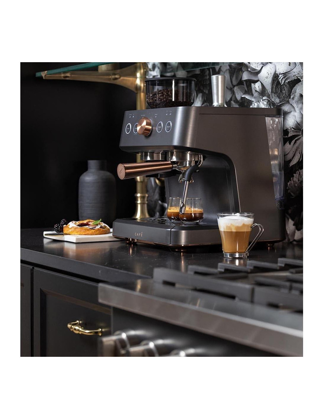 La galardonada Máquina de Espresso Semi Automática Cafetería Bellissimo está diseñada para profesionales del espresso que desean una preparación fácil mientras mantienen el control total sobre la extracción. Esta máquina de espresso inteligente se sincroniza con la aplicación SmartHQ, lo que permite personalizar las preferencias de bebida por volumen y fuerza. Con una varita de vapor integrada que rota en un movimiento de 180 grados para control y conveniencia, puedes obtener una variedad de texturas y grosores de microespuma para lattes, flat whites, cappuccinos y más. Obtén una taza de espresso equilibrada con cada uso gracias a una bomba de 15 bar fabricada en Italia que aumenta lentamente su presión nominal para extraer sabores. El molinillo de muelas cónicas de acero inoxidable entrega una cantidad exacta de café molido fresco directamente en el portafiltro, y con 15 niveles de molienda, proporciona la capacidad de ajustar la extracción perfecta. Con 1300 vatios de potencia, esta máquina calienta el agua de inmediato y de manera constante para asegurar un espresso de calidad cada vez. Disfruta de más bebidas con menos recargas gracias a un depósito de agua de 95 onzas. Esta moderna máquina de espresso está adornada con acentos de cobre que añaden sofisticación a cualquier encimera. El kit de limpieza de la máquina de espresso incluye un pin, solución desincrustante, tira de prueba de dureza del agua y un cepillo de limpieza que también sirve como herramienta de extracción de filtros. También incluye un tamper de acero, una jarra de espumado de acero inoxidable cepillado y filtros de una y dos capas.