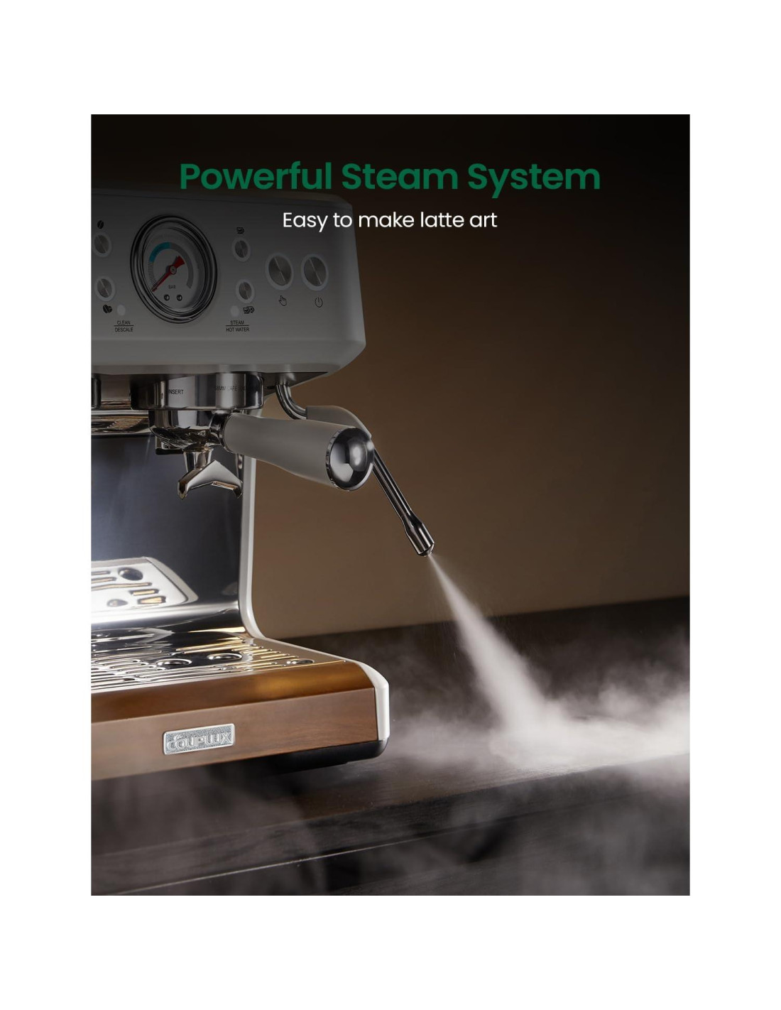 - [Espumado estilo barista y diseño de doble caldera] Crea espuma de calidad de café en casa con el espumador de leche de nuestra máquina de espresso de doble caldera. El vapor a alta presión entrega espuma cremosa para lattes y cappuccinos. La varita de vapor también funciona como dispensador de agua caliente: gira la perilla para cambiar de modo y eliminar residuos para una fácil limpieza. El sistema de doble caldera te permite preparar espresso y espumar leche al mismo tiempo, haciendo que las bebidas profesionales sean sencillas.