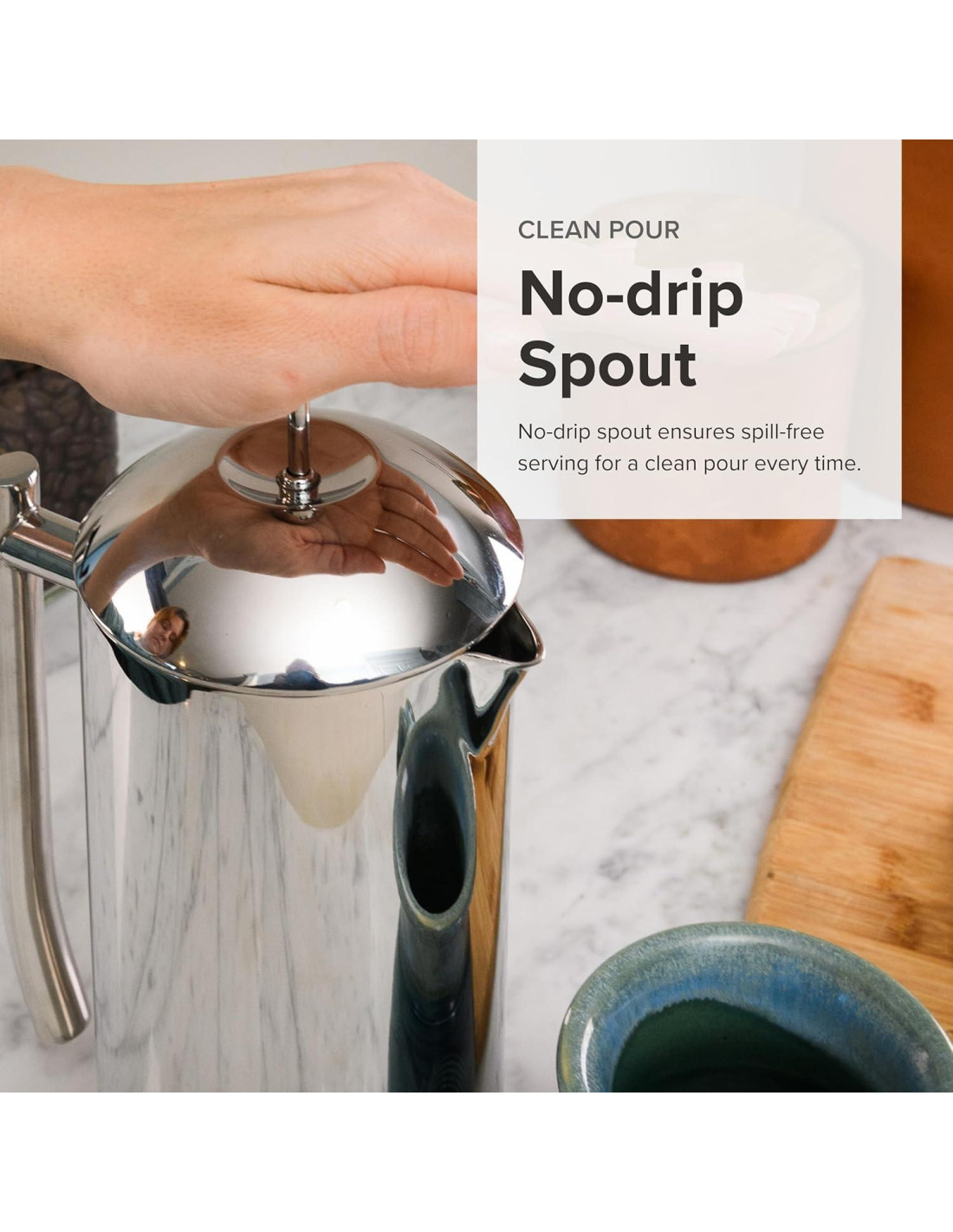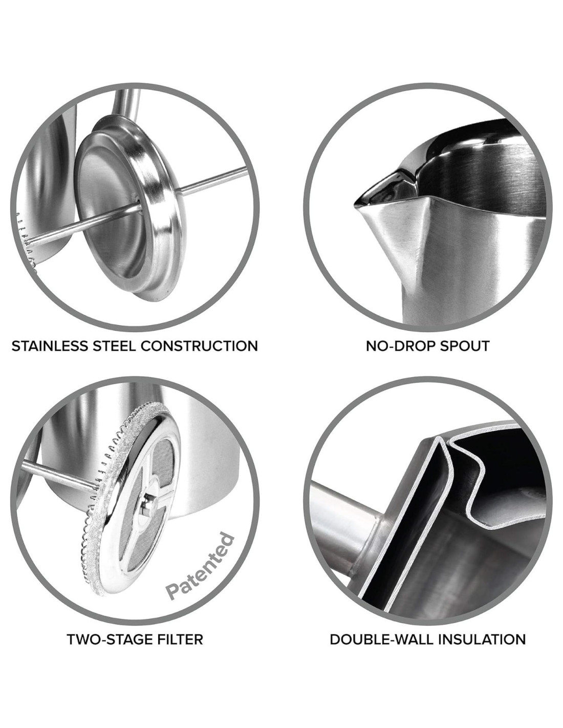 - Excelencia en Diseño Aislado: Con un diseño de doble pared, esta cafetera de acero inoxidable retiene el calor hasta cuatro veces más que las alternativas de vidrio. Su construcción de acero inoxidable pulido asegura durabilidad, eliminando preocupaciones sobre vidrio roto o óxido y superando a una cafetera de vidrio.