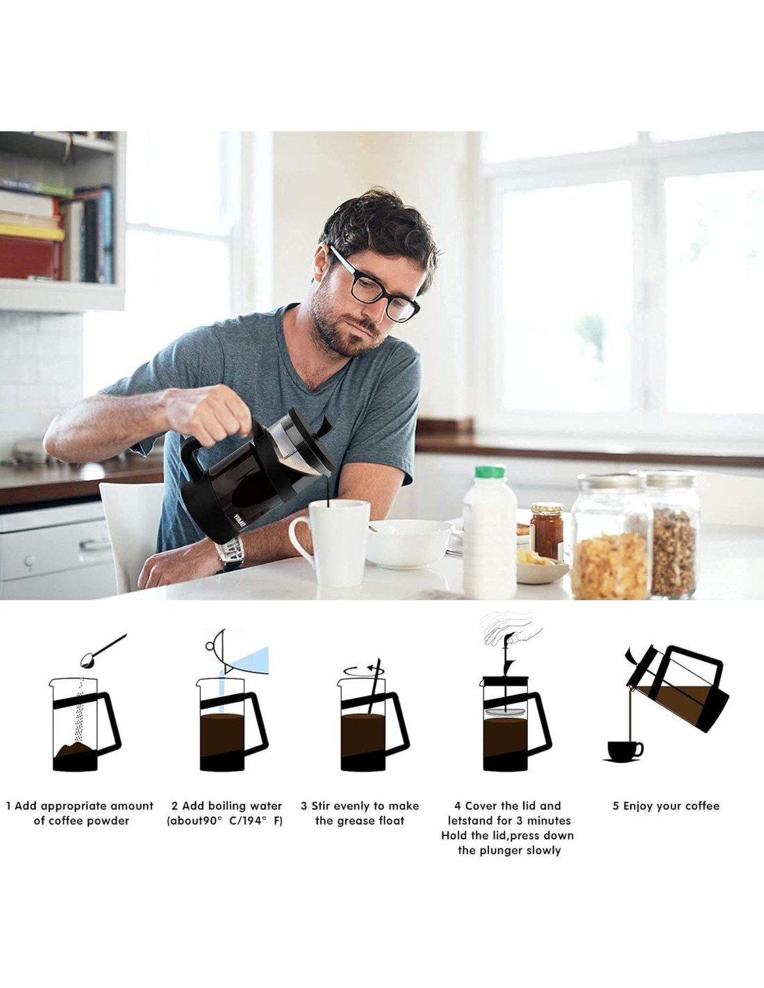 - La Cafetera de Prensa Francesa YiiMO te permite preparar una deliciosa taza de café en solo 3 minutos. Su diseño portátil y estable la hace perfecta para preparar café francés fresco, té, espresso o infusión en frío sobre la marcha, ya sea en casa, en un picnic, en la oficina, acampando o viajando. Su tamaño compacto y diseño fácil de usar la hacen conveniente para llevar contigo a donde vayas.
