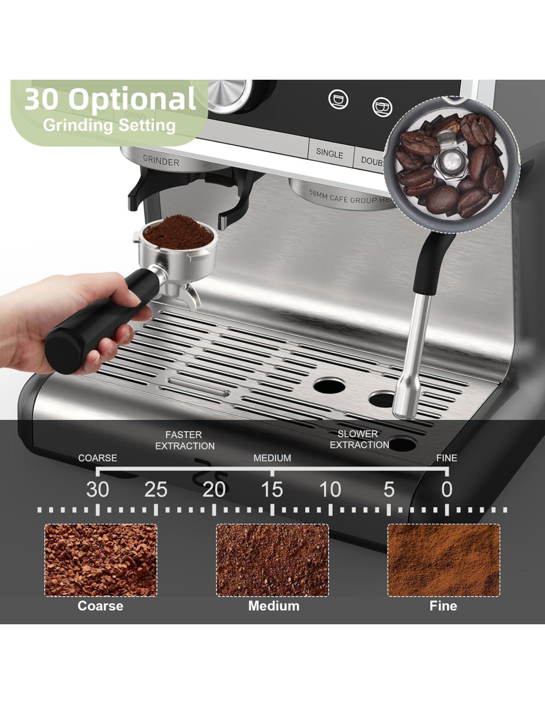 - 30 TAMAÑOS DE MOLIENDA OPCIONALES: Personaliza tu experiencia de café con 30 tamaños de molienda para ajustar el grosor de tu molienda, proporcionando control y personalización para adaptarse a diferentes granos de café. Disfruta de un proceso de molienda simple e intuitivo adaptado a tu preferencia.