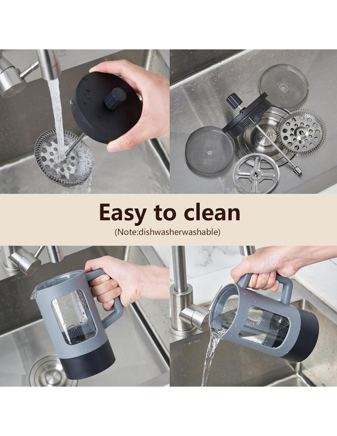 - 4. Fácil de limpiar: Nuestra prensa francesa de vidrio está diseñada para una limpieza sin complicaciones. Disfruta de una experiencia de limpieza sin estrés, perfecta para mañanas ocupadas o viajes.