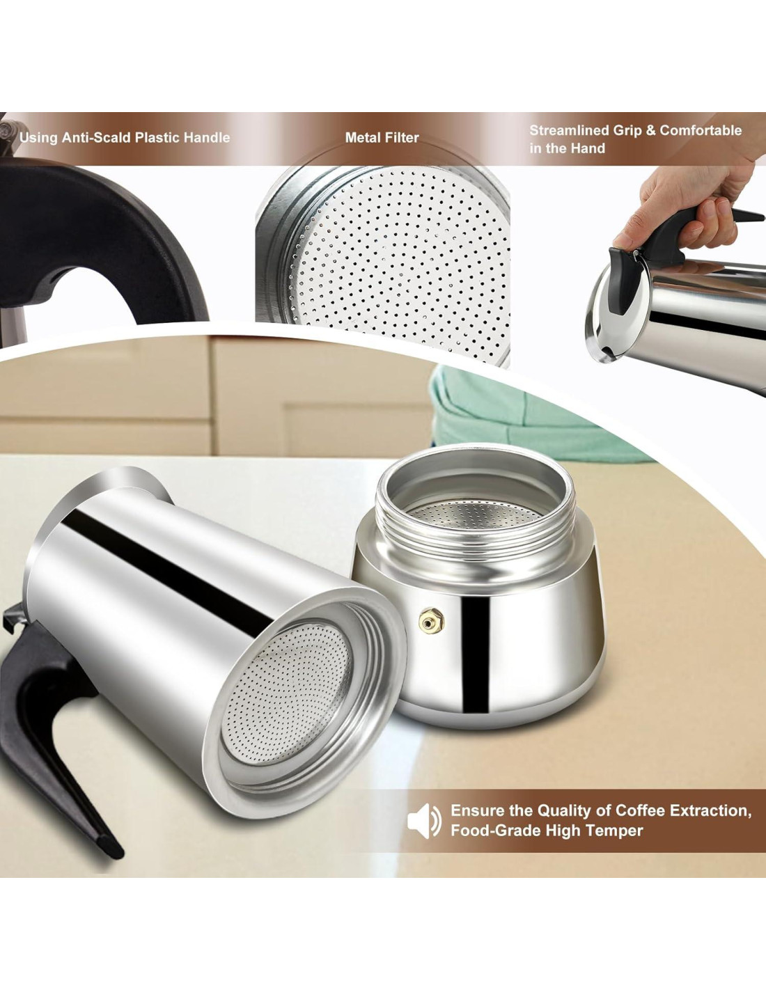 - Compatible con Todas las Estufas: Esta cafetera espresso de estufa es adecuada para cualquier estufa, como gas, estufa de inducción, estufa de cerámica, estufa eléctrica, estufa de alcohol y estufa de camping de propano. No necesitas salir, puedes hacer fácilmente tus lattes, mochas, batidos, macchiatos y cappuccinos favoritos. Usamos ingredientes de alta calidad para hacer la extracción, haciendo que el café sea más sabroso y brindándote un disfrute de café de alta calidad.