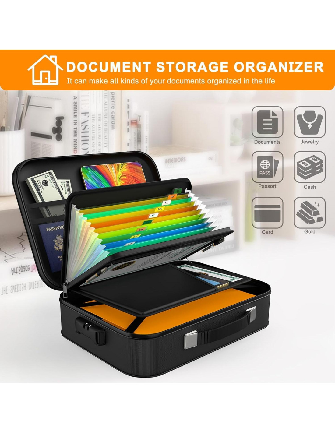 - Manteniendo Documentos Importantes Seguros y Ordenados: También es sorprendentemente espaciosa, lo que permite una fácil organización de varios artículos. La caja de documentos incluye 12 carpetas de bolsillo que se ajustan a documentos de tamaño carta o A4. Puede ayudarnos a clasificar documentos para que podamos encontrarlos rápidamente. El organizador de documentos a prueba de fuego tiene 4 pequeñas bolsas de malla, 16 ranuras para tarjetas, 4 unidades USB, 4 grandes bolsillos de malla, 2 soportes para bolígrafos y un bolsillo principal.
