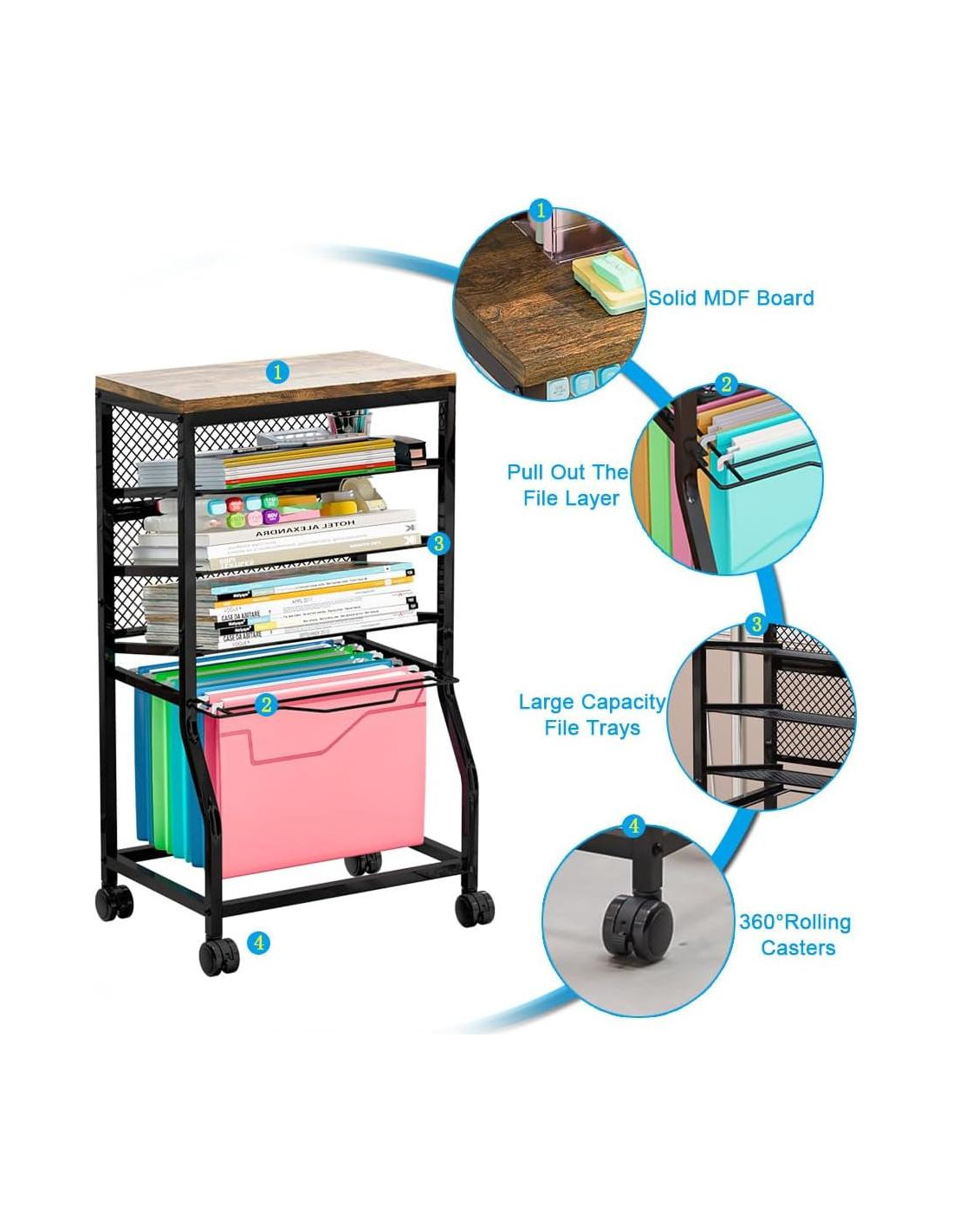 - Multifuncional Este Carro de Archivos Rodante es adecuado para la organización de oficinas, aulas escolares, estudios en casa y escritorios, especialmente para almacenar documentos, libros, revistas, etc.