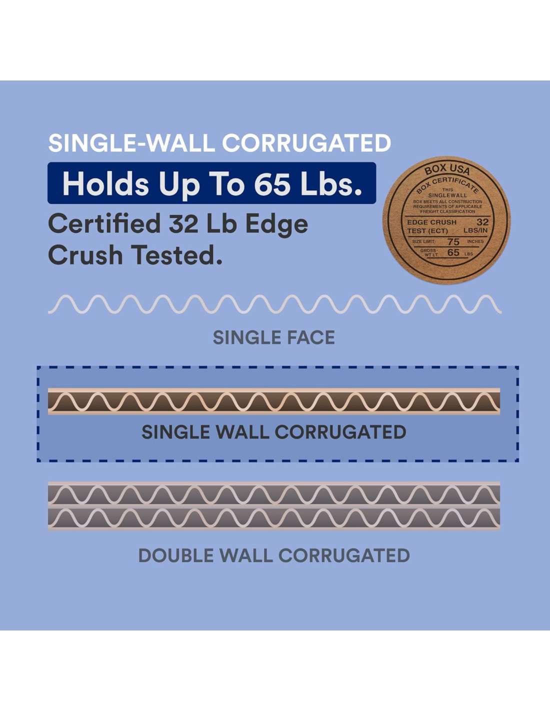 - CAJAS DE ALTA RESISTENCIA: Soporta hasta 65 lbs (29.5 kg), 32 lb (14.5 kg) probado para resistencia al aplastamiento en el borde, certificado y probado para cumplir con todos los requisitos de almacenamiento, envío y carga de cajas de pared simple