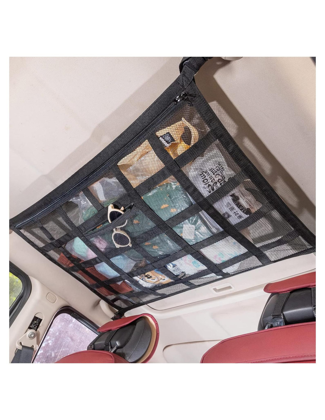 - Ahorra espacio y gran capacidad: La red de almacenamiento para techo de SUV mejorada tiene 4 hebillas de fijación, mantas para bebés, juguetes para niños, toallas de papel y otros objetos ligeros pueden colocarse en la red de almacenamiento del techo del SUV, el diseño puede ayudar a colocar muchos objetos de forma irregular, diseño de malla transparente, así puedes encontrar tus cosas fácilmente en lugar de arrastrarte a los asientos traseros del coche buscando en el maletero.