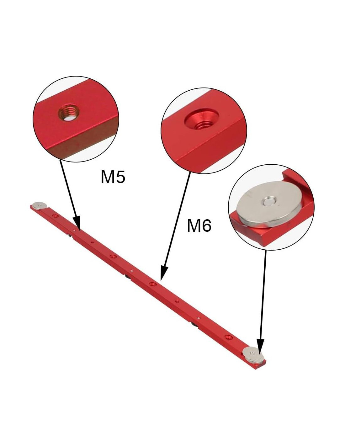 - Características del producto: Hay 4 orificios para tornillos M6 y 2 orificios para tornillos M5 en la barra de inglete de 450mm (17.7in), que pueden conectar la mayoría de las piezas de trabajo y accesorios de carpintería. Hay una polea con un diámetro de 22.8mm en ambos extremos de la barra de inglete, para que la barra de inglete pueda deslizarse fácilmente en la pista T. Durante el uso no se caerá. Satisface las necesidades del trabajo de carpintería diario.