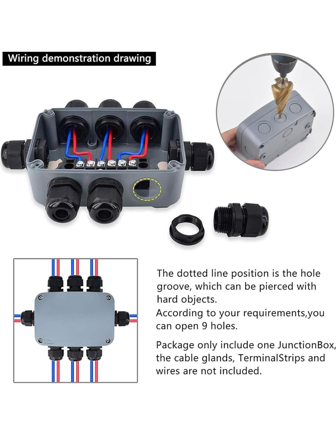 - Conector de Cable Relacionado La caja de proyecto a prueba de agua se puede configurar con Juntas de Conector de Cable de 20 mm, puedes comprarlas adicionalmente según tus necesidades. La caja de conexiones a prueba de agua es adecuada para barco, garaje, casa, jardín, granja, estanque, subterráneo, terraza, taller, sitio de construcción, cableado externo o iluminación externa, etc.