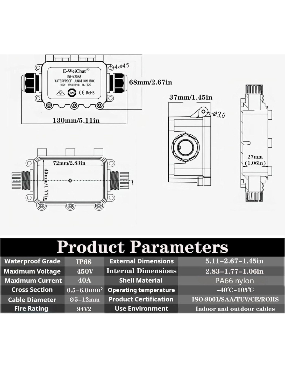 - especificaciones de la caja de conexiones: caja de conexiones impermeable SZFUDIGO de 2 vías, una entrada, una salida. con una corriente nominal de < 40A y un voltaje nominal de < 450V para el bloque terminal correspondiente. Diámetro de cable soportado: 5-12mm, área de sección transversal del cable: 0.5-6.0mm, temperatura de trabajo: -40 C +/- 105 C. Dimensiones externas: 13.00-6.78-3.68cm, dimensiones internas: 7.19-4.49-2.69cm