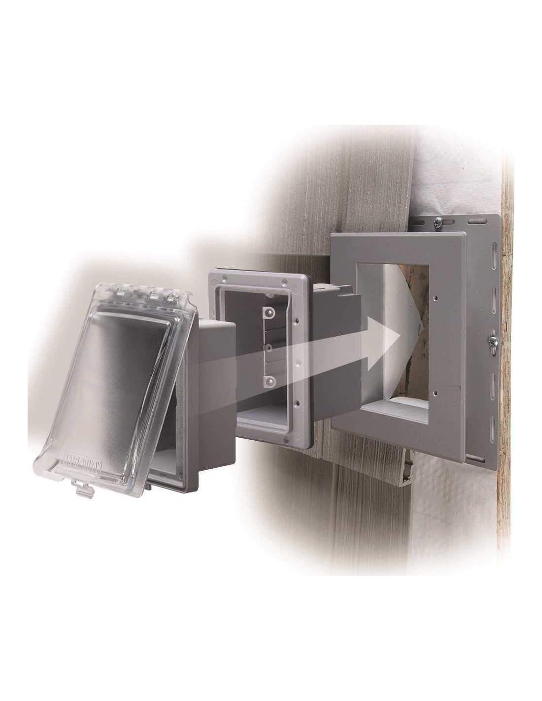 Caja de salida de pared empotrada para exteriores. Para trabajo nuevo y trabajo antiguo, compatible con tipos y materiales de revestimiento comunes como vinilo, madera, estuco, ladrillo y bloque. A prueba de climas, se monta horizontal o verticalmente, y se monta en vigueta o en la pared. Compatible con receptáculos duplex, GFCI (interruptor de circuito por falla a tierra) o receptáculo redondo - receptáculo no incluido. Pintable, profundidad interior de 2-3/4 pulgadas (6.99 cm) para enchufes grandes y cables, incluye brida opcional para revestimiento, capacidad de cableado de 21.0 pulgadas cúbicas (344.5 cm), (2) orificios excéntricos de 0.5 pulgadas (1.27 cm)/0.75 pulgadas (1.90 cm). Dimensiones: 4.56 pulgadas (11.56 cm) de ancho x 6.15 pulgadas (15.62 cm) de alto x 4.98 pulgadas (12.65 cm) de profundidad.