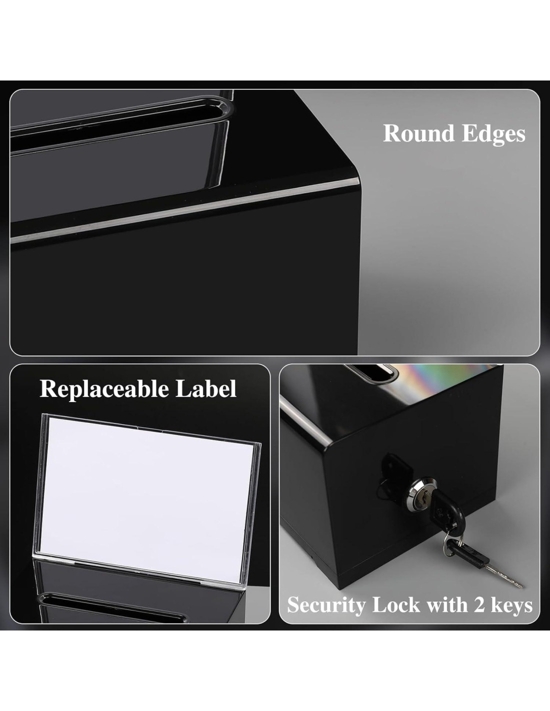 - [Mecanismo de Cerradura Seguro] Equipado con un mecanismo de cerradura seguro, y provisto de dos llaves, la caja de donaciones asegura su seguridad, previniendo el acceso no autorizado y la manipulación.