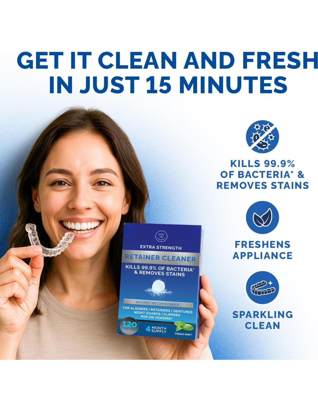 - LIMPIEZA PROFUNDA DE EXTRA FUERZA EN SOLO 5 MINUTOS - Experimenta frescura de siguiente nivel con nuestras tabletas limpiadoras de retenedores premium, formuladas para una limpieza rápida y profunda en tan solo 5 minutos. Estas tabletas potenciadoras ultrasónicas disuelven placa, partículas de comida y manchas en todos los aparatos dentales sin necesidad de fregar.