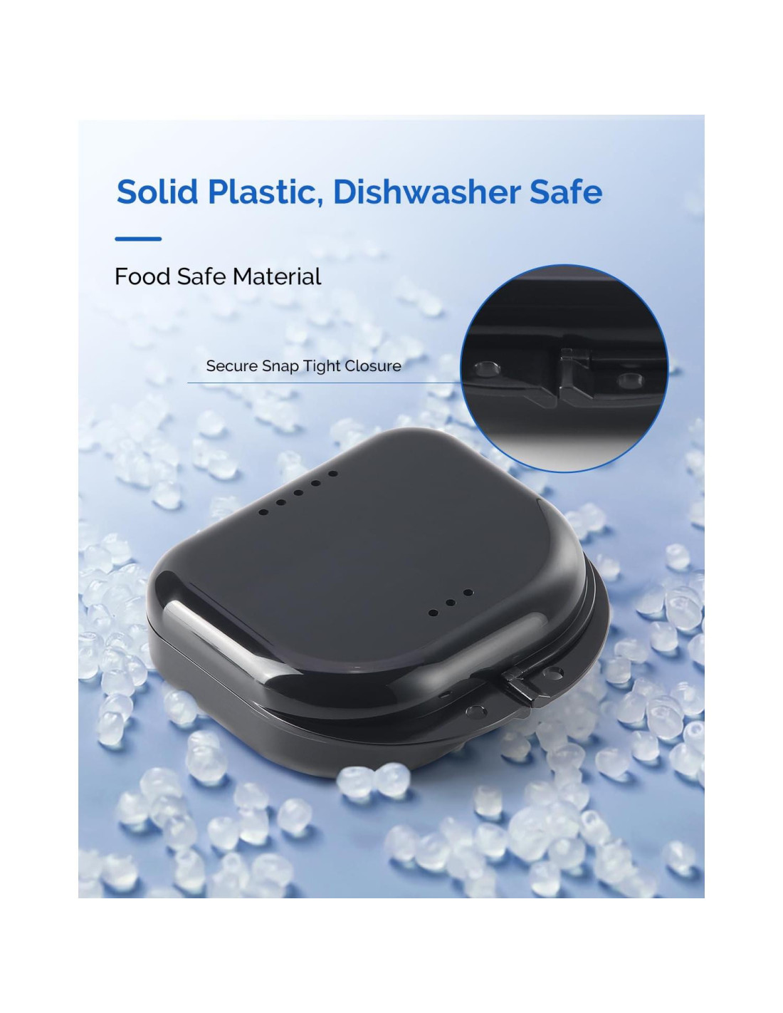 - Agujeros de Ventilación: Nuestra caja para retenedor tiene agujeros de aire en ambos lados, superior e inferior, para un secado rápido