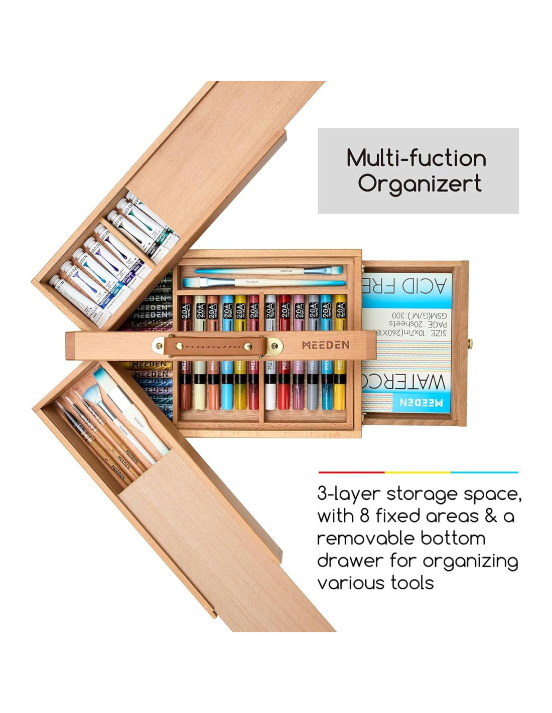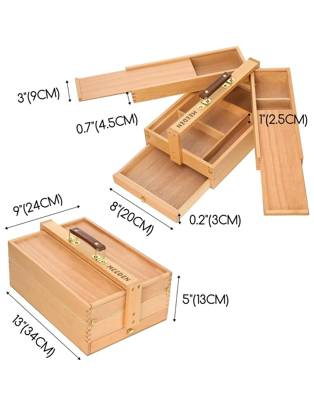 - El interior está dividido en tres niveles de 8 compartimentos y un gran cajón deslizante, perfecto para organizar plumas, lápices, carbón, herramientas de difuminado, tintas, pequeños accesorios y más