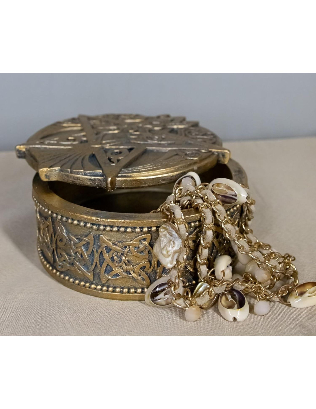 - Presentamos nuestra Caja Decorativa Redonda de Pentáculo de Cuervo Celta, un tesoro de misticismo y elegancia. Esta exquisita caja es un testimonio de la rica herencia celta, adornada con símbolos sagrados que resuenan con la sabiduría antigua y el significado espiritual. El intrincado trabajo de nudos rúnicos celtas y el poderoso simbolismo del cuervo y el pentáculo crean un tapiz visual hipnotizante que te sumerge en un mundo de encantamiento.
