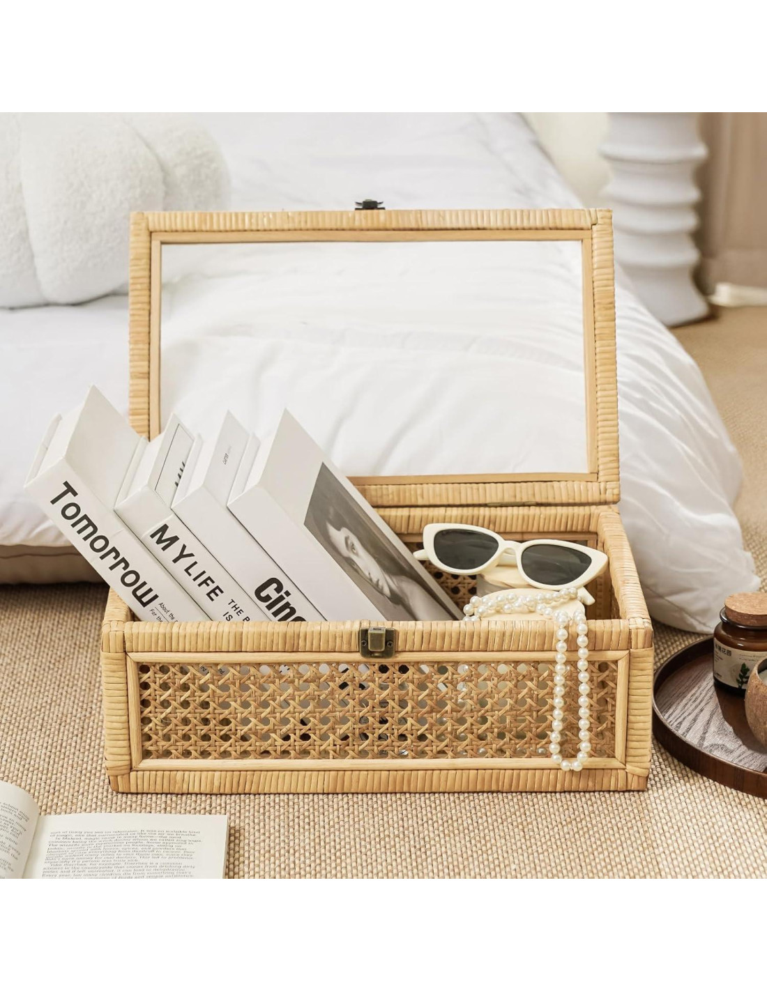 - Material de Alta Calidad: Tejido a mano de ratán natural y construido sobre un marco de madera sólida, esta caja muestra un tejido limpio y un aspecto hecho a mano con carácter bohemio. El cierre de metal bronceado añade un toque vintage mientras mantiene la tapa cerrada de forma segura. Sencillas pero adorables, estas cajas apilables se integran fácilmente en espacios cotidianos y reflejan un cuidado artesanal en el hogar.