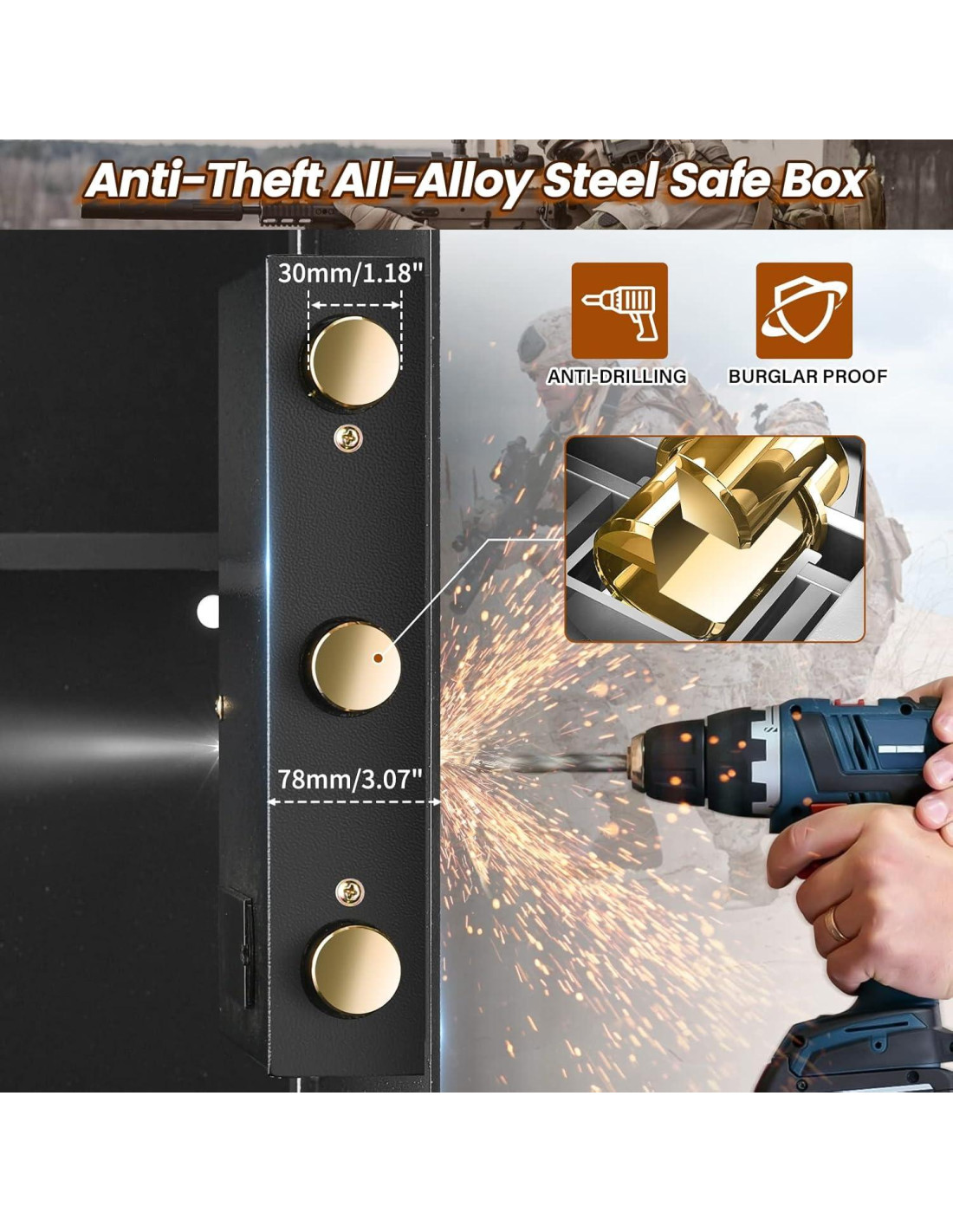 - Diseño Resistente a Palancas y Antirrobo: La caja fuerte digital de seguridad ANTI-ROBO AVANZADA incluye una puerta de acero sólido reforzado resistente a palancas de 78 mm, pernos de bloqueo de núcleo sólido de alta resistencia de 30 mm y bisagras duales anti-impacto, ofreciendo protección confiable para sus objetos de valor. ¡TODO ACCESO ILEGAL ESTÁ DENEGADO! Almacene de manera segura su efectivo, joyas, documentos, pasaportes, herencias y más en esta caja fuerte para el hogar. Disfrute de la tranquilidad de saber que sus activos y pertenencias valiosas están guardados de forma segura