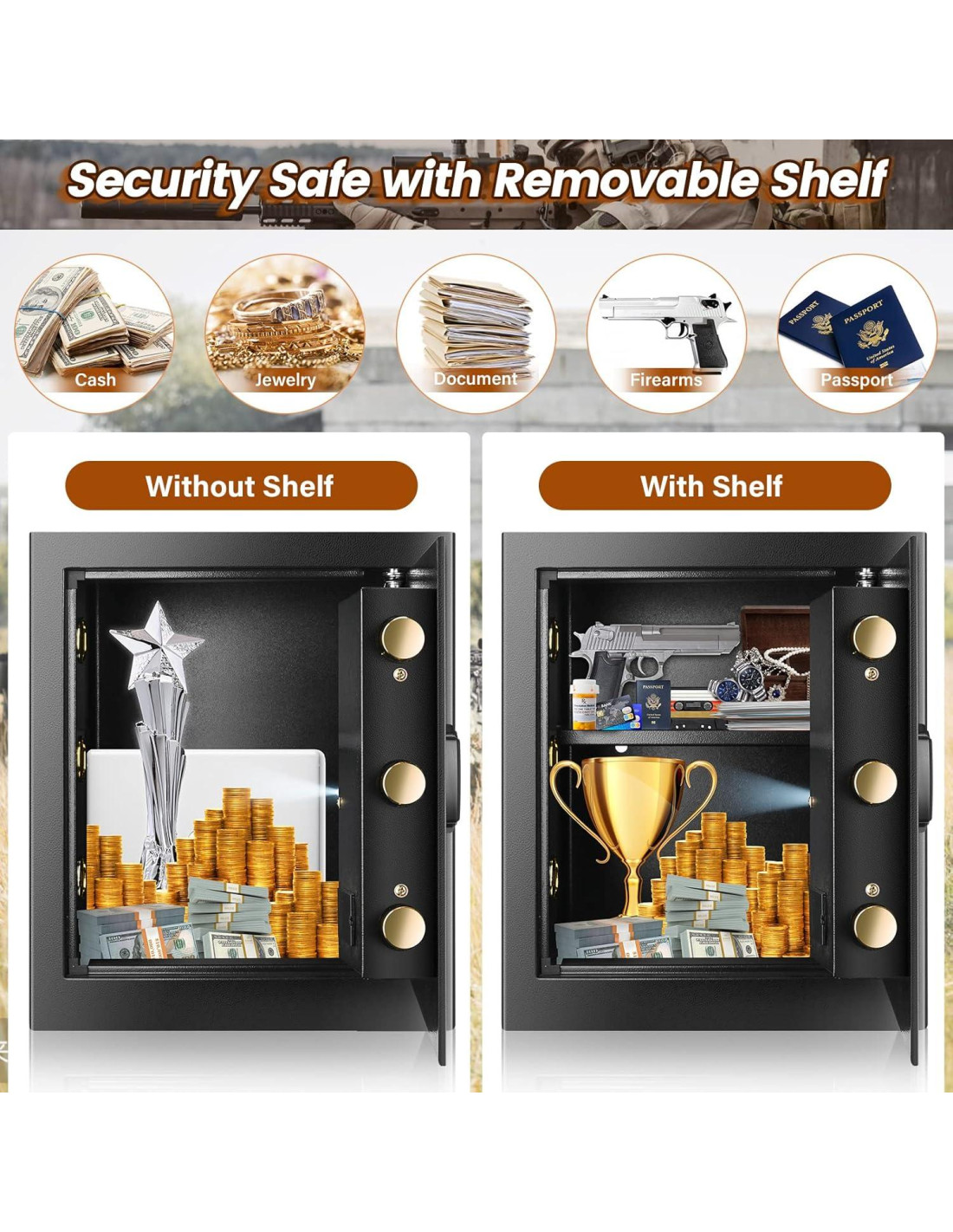 - Caja Fuerte Grande para el Hogar con Bolsa a Prueba de Fuego: Gran capacidad de 2.8 pies cúbicos. Exterior: 14.9" (37.8 cm)Wx11.2" (28.4 cm)Dx17.7" (44.9 cm)H; Interior: 14.5" (36.8 cm)Wx11" (27.9 cm)Dx17.32" (43.9 cm)H. La gran caja fuerte de seguridad le permite cargar casi todos sus objetos de valor y mantenerlos alejados de miradas curiosas. Y viene con una bolsa de documentos A4 a prueba de fuego que también protege sus objetos de valor de incendios, huracanes y terremotos. El estante extraíble también le ayuda a organizar sus cosas importantes fácilmente. MEJOR ELECCIÓN PARA MANTENER SUS VALIOSOS ALEJADOS DE NIÑOS O VISITANTES CURIOSOS