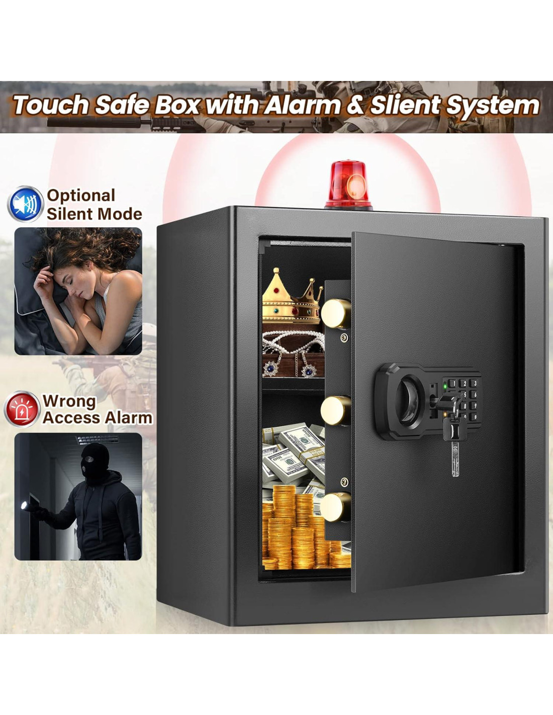 - 3 Métodos de Desbloqueo: El teclado programable con indicador Led puede establecer 2 códigos separados (hasta 8 dígitos), y puede acceder a sus objetos de valor muy rápidamente con su propia combinación digital. Si olvida la contraseña, puede abrir la caja fuerte con la llave de emergencia. O si la batería se agota, puede usar la caja de batería de emergencia. NUNCA TENDRÁ QUE PREOCUPARSE POR QUEDARSE FUERA DE SU CAJA FUERTE. La caja fuerte también se puede configurar en modo silencioso, lo que es conveniente para usar en diferentes situaciones