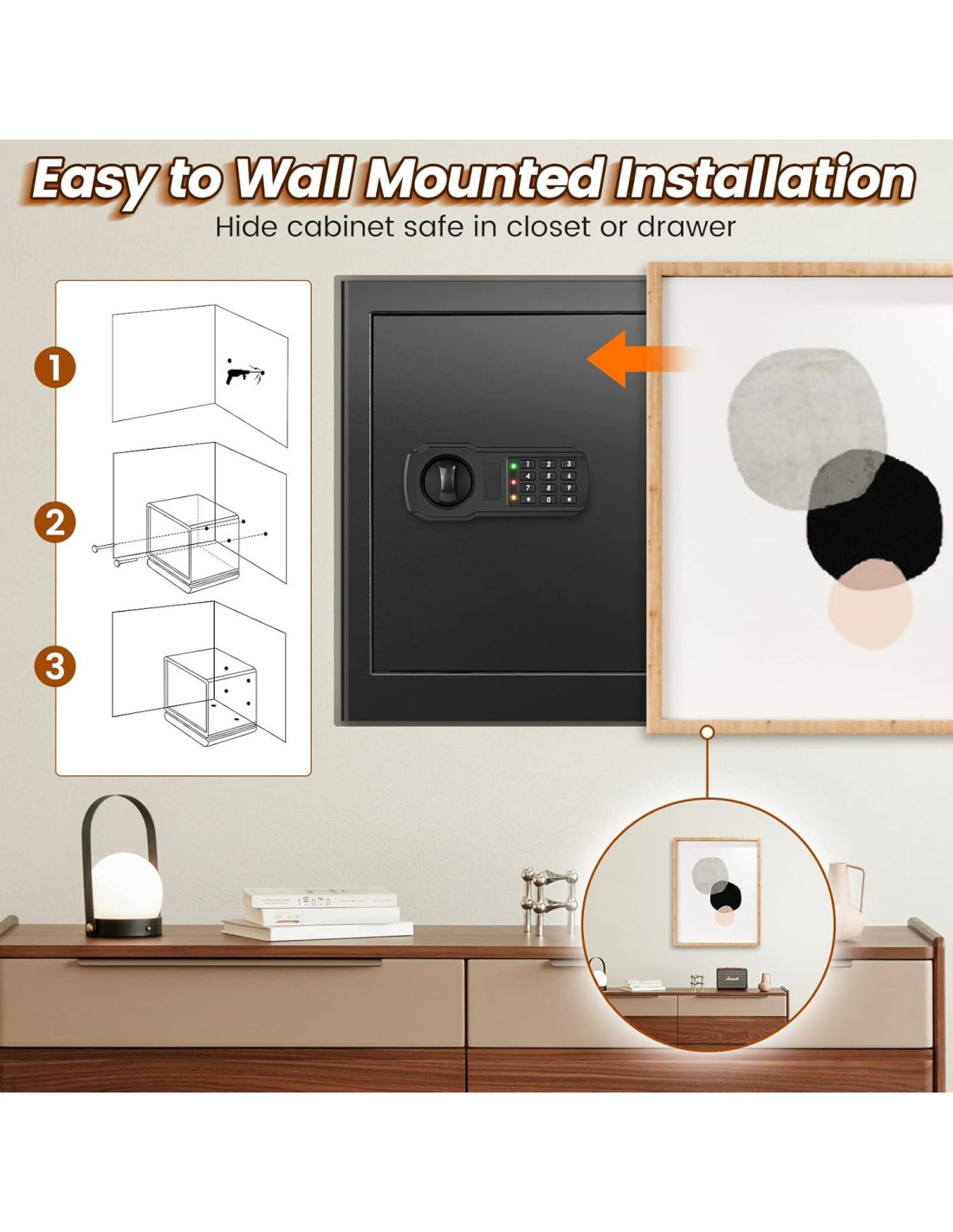 - Recordatorio de Alarma y Diseño de Anclaje: PARA PREVENIR ADIVINANZAS DE CONTRASEÑAS, nuestra caja fuerte proporciona un sistema de bloqueo automático y alarma: 3 entradas incorrectas pueden activar la función de bloqueo automático, y el sistema sonará una alarma, alertándole sobre intentos de robo. PARA PREVENIR AÚN MÁS EL RIESGO DE ROBO, también tiene orificios de montaje pre-perforados e incluye hardware de montaje para montarla en un armario, estante o debajo del piso
